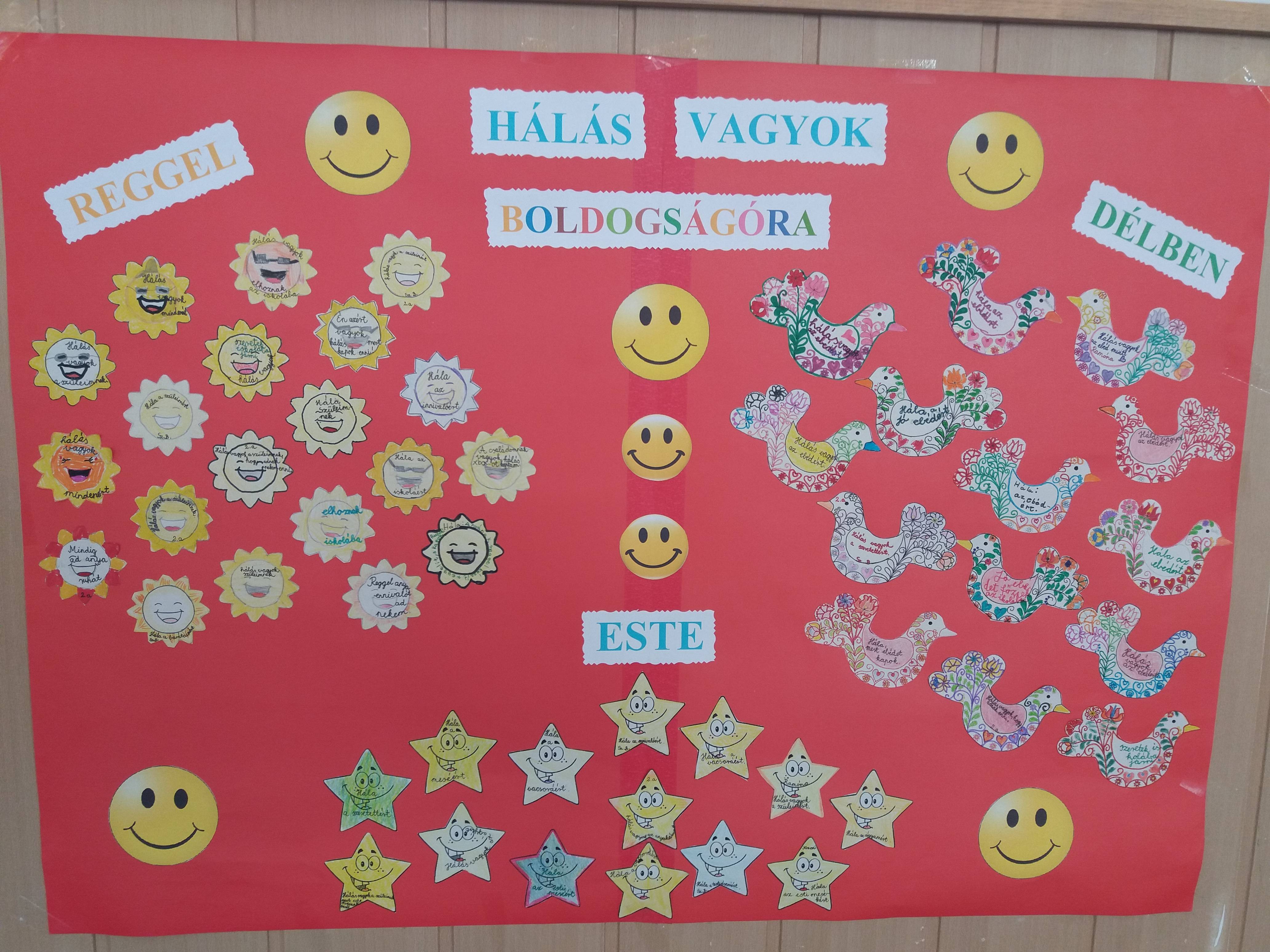 A gyerekek nagy örömmel és érdeklődéssel vettek részt a boldogságórán. Megbeszéltük mit jelent a hála, többször meghallgattuk Bagdi Bella a hála témához tartozó dalát, amit a gyerekek már nagyon ügyesen tudnak énekelni. Elkészítettük a közös plakátunkat, hogy reggel, délben, este mi mindenért lehetünk hálásak, majd kitettük a tantermünk mellé a folyosóra, hogy az iskolába járó gyerekek is megcsodálhassák.