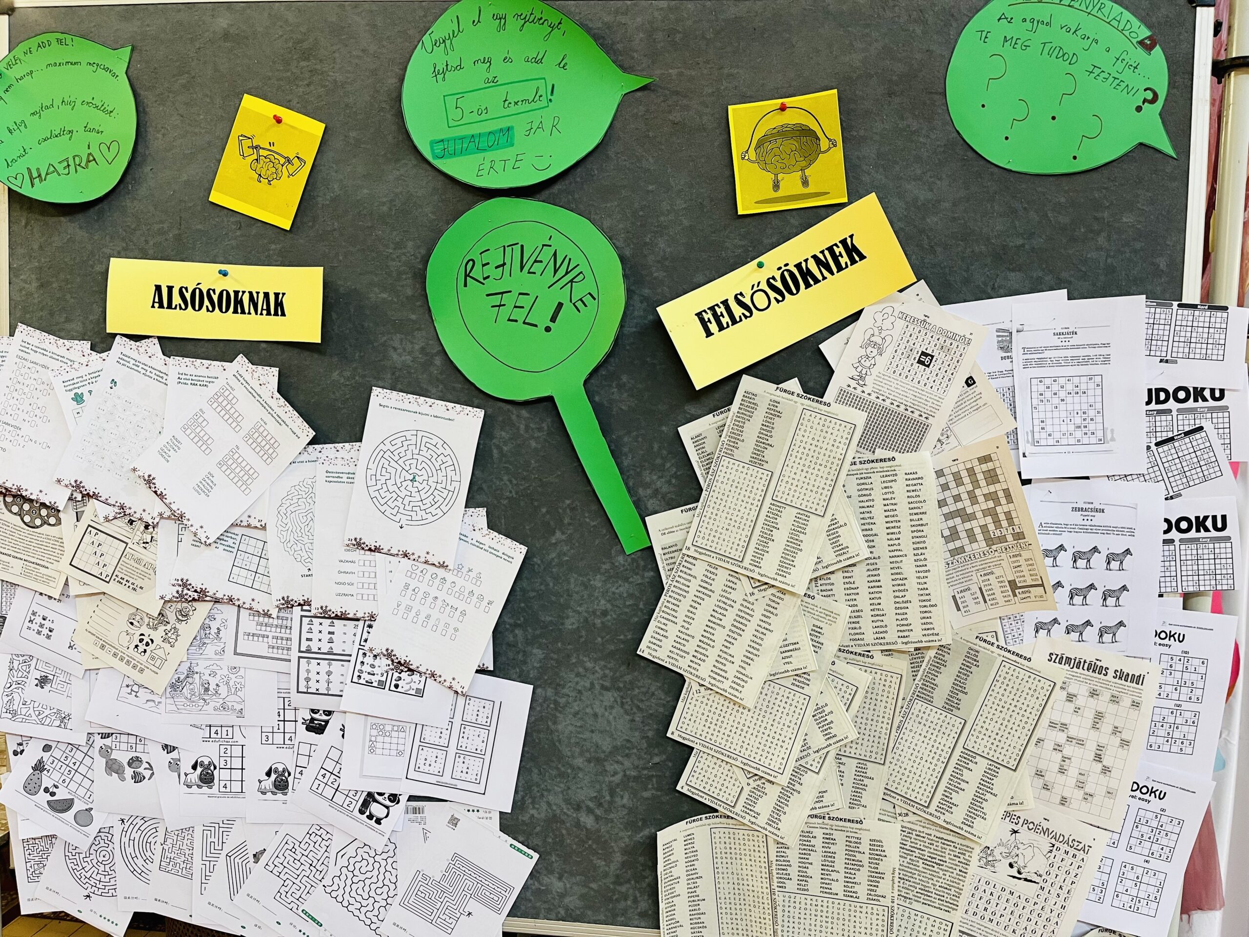 Egy egész iskolát megmozgató projekttel készültem „Rejtvényre fel!” címmel. Küldetésre hívtam a tanulókat számtalan fejtörőt helyeztem ki az iskola faliújságjára. Aki levett egyet, megoldotta, majd kitöltve visszahozta, jutalmat kapott érte. Nagy meglepetésemre óriási érdeklődés övezte a kezdeményezést, az alsó és felső tagozatos diákok egyaránt lelkesen kapcsolódtak be, a rejtvények szinte pillanatok alatt elfogytak.