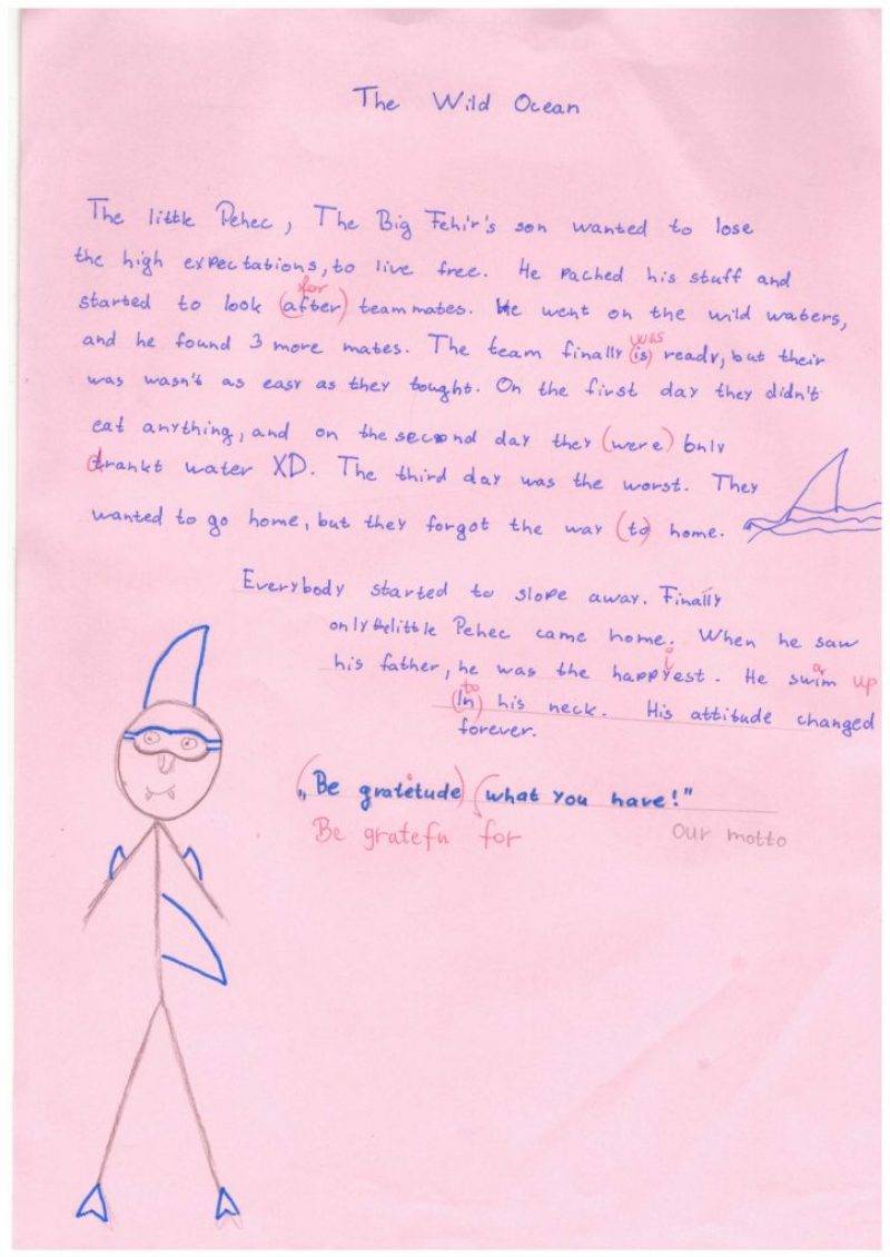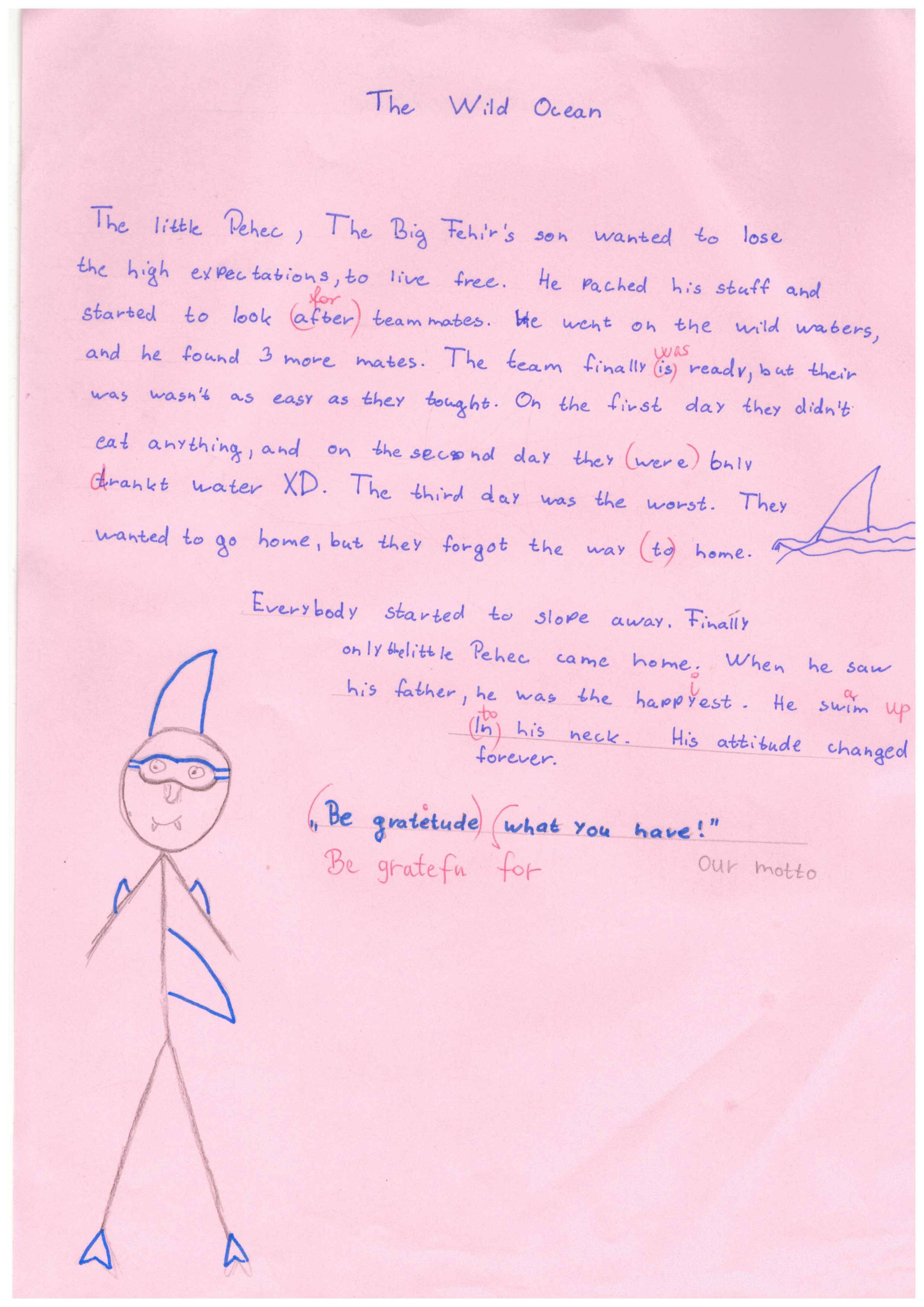 A ‘Boldogságfokozó hála’ témakör bevezetése után a tanulók 5 fős csoportokban reklámot találtak ki a ‘hála’ fontosságának reklámozására. A reklám szövegét leírták, majd előadták a reklámot. Videó felvételt nem szerettem volna készíteni a gyerekekről.