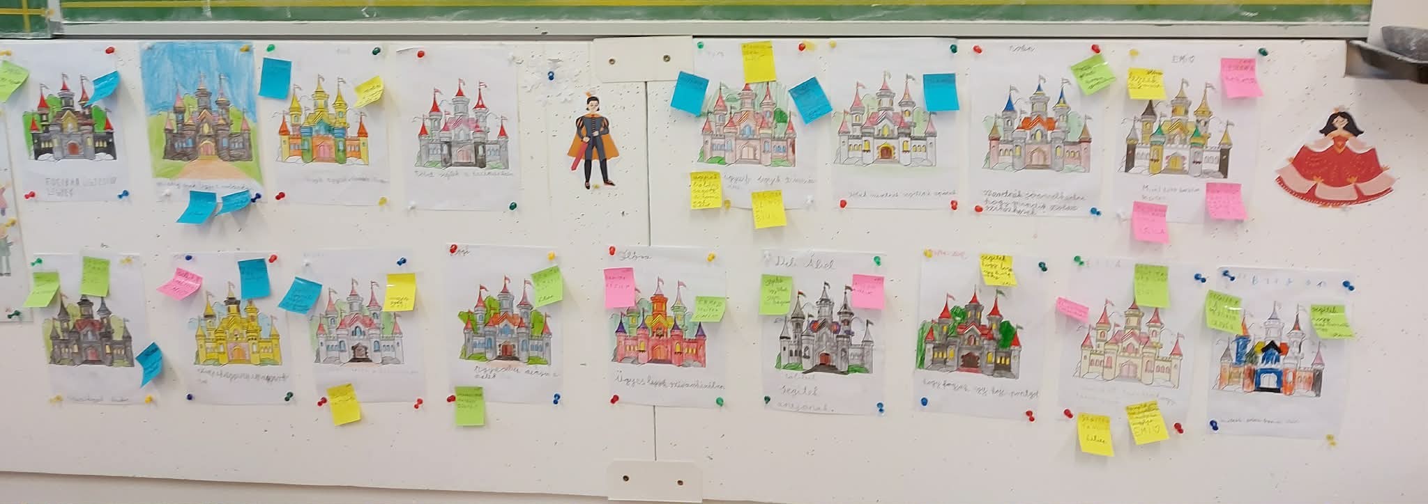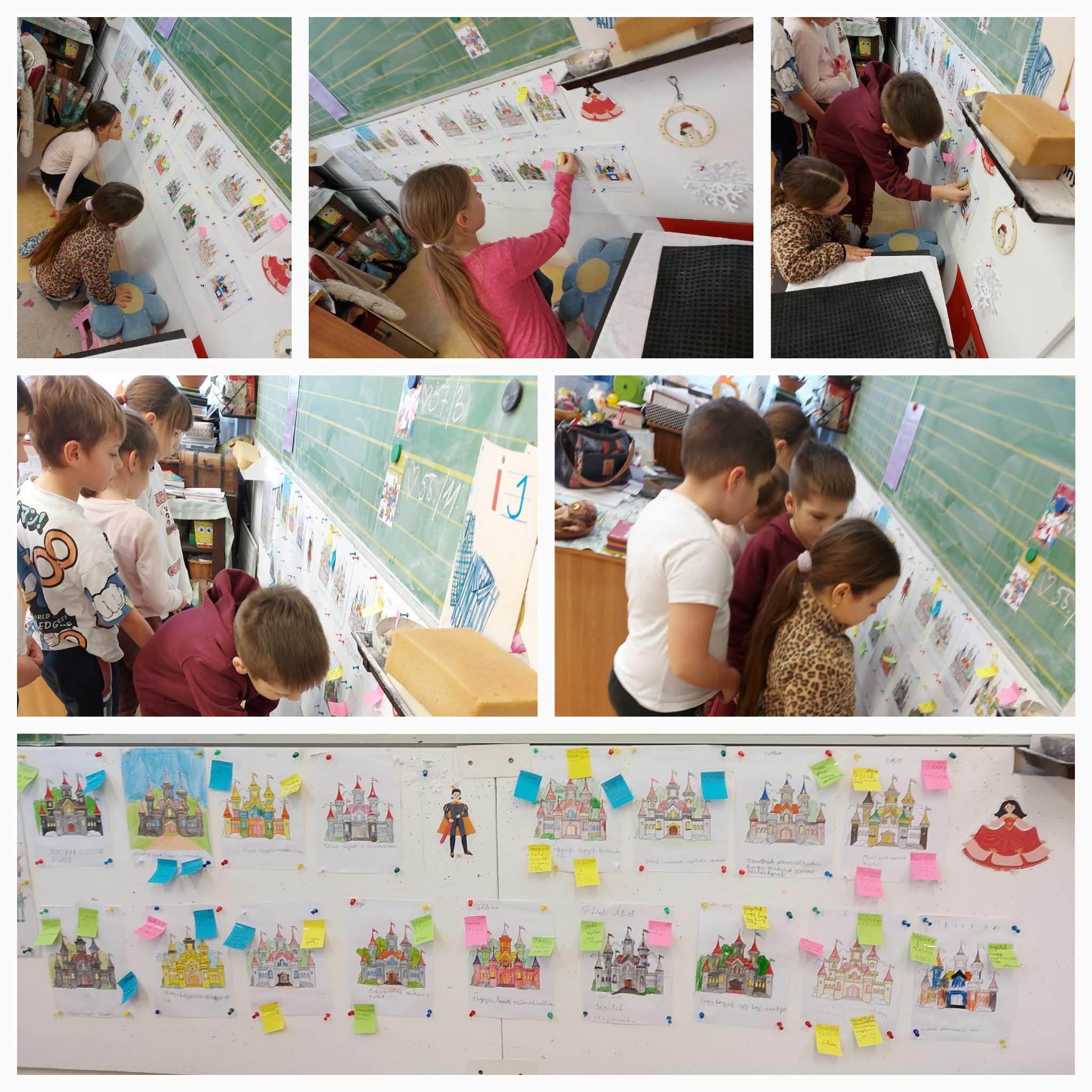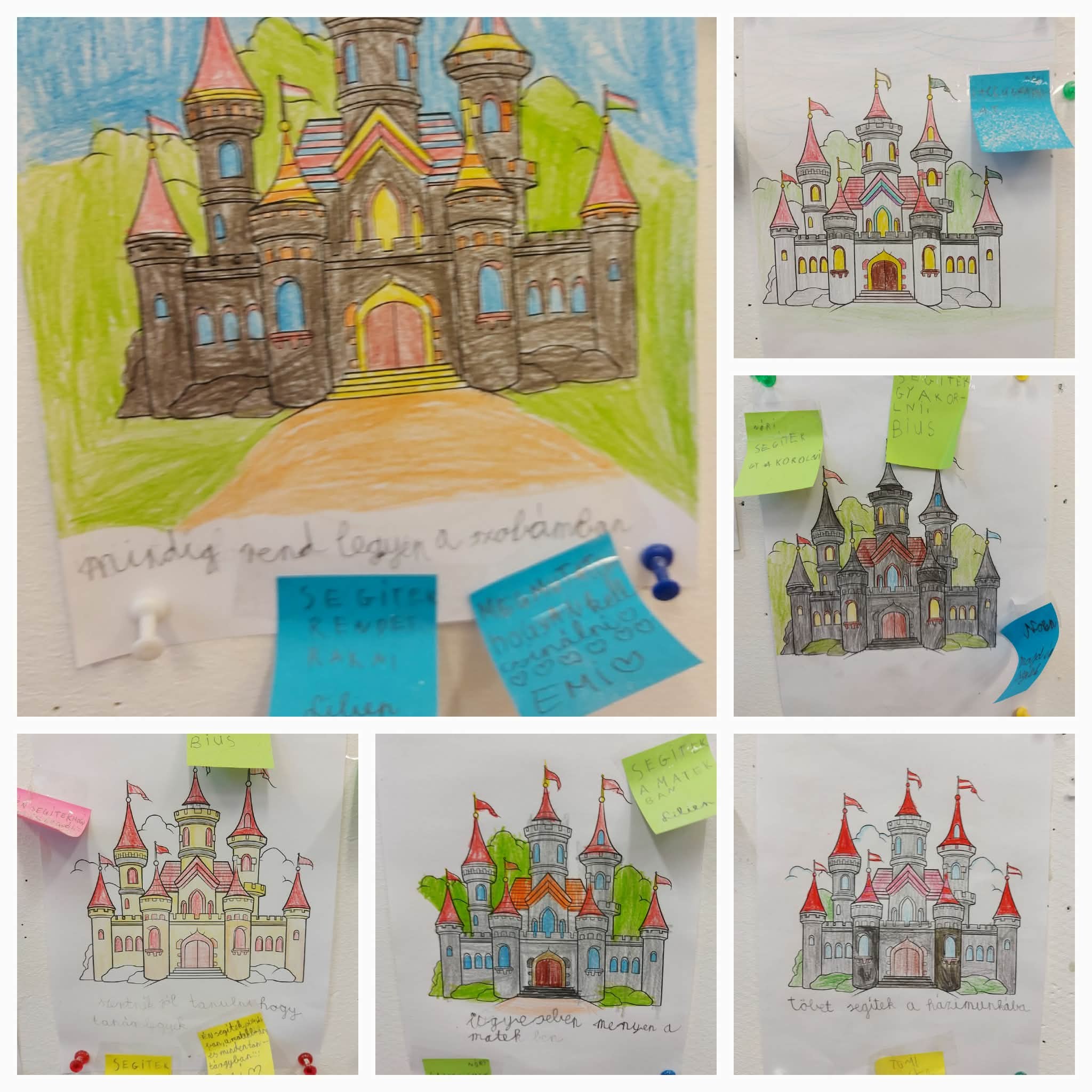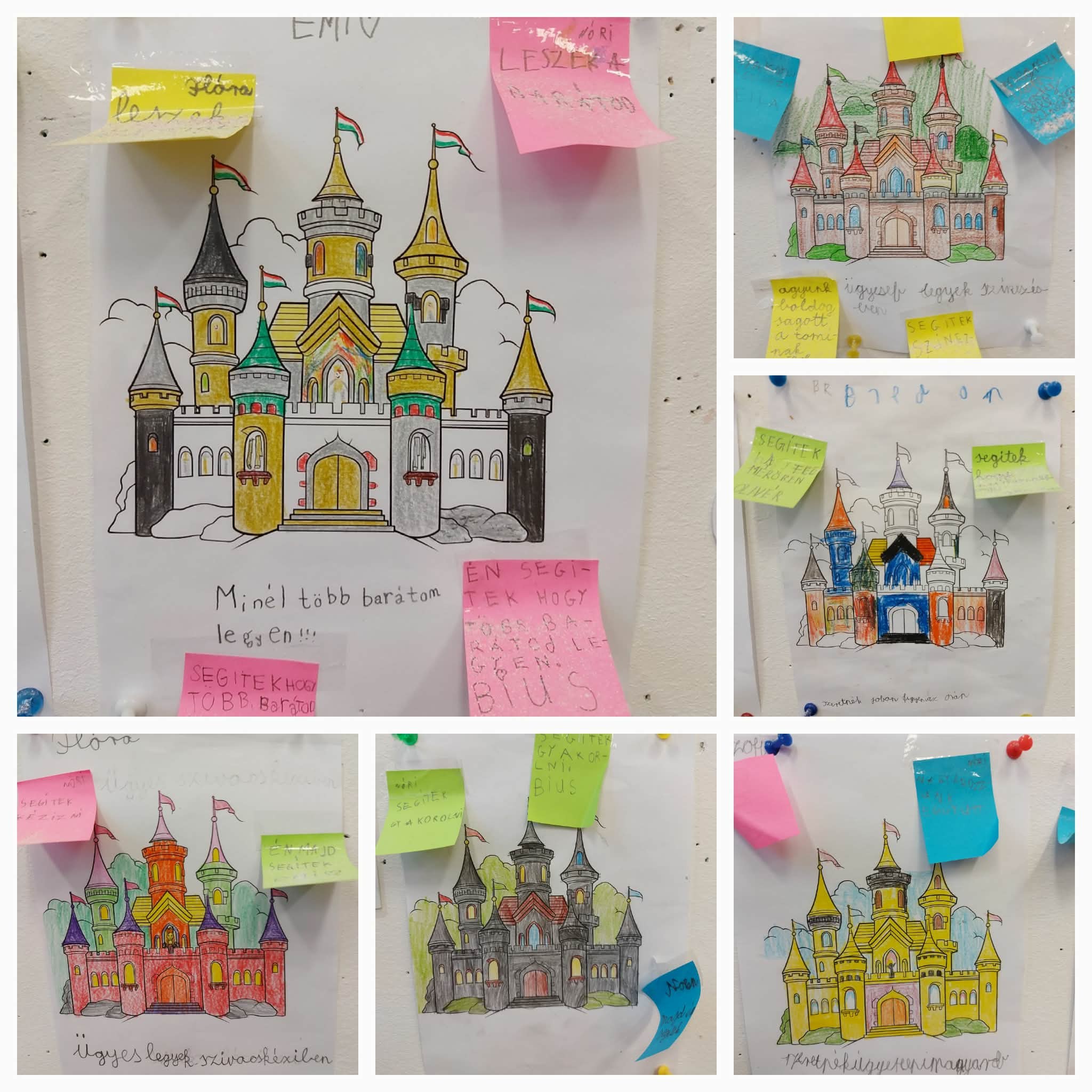 A második órát „Meglengetem a karom, pedig alig akarom” relaxációs gyakorlattal kezdtük. A gyerekek felsorolták, hogy mik a céljaik, milyen célt szeretnének a közeljövőben elérni („ügyesebb lenni a szivacskéziben”, „többet segíteni anyának”, „rendet tartani a szobámban”, „több barátom legyen”). Ezt a célt odaírták a színezőjükre a kastély alá. Kitettük a lapokat a falra. A gyerekek megnézték egymás színezőjét, elolvasták egymás céljait. Fogtak színes lapocskákat és ráírták, hogy kinek hogyan tudnának segíteni céljaik elérésében. Készítettünk egy tablót is, ahova azt írták le színes lapocskákra, hogyan ünneplik majd meg, ha elérik a céljukat (pl. sütizés, kirándulás, közös sütés-főzés). A második órát is meditációval zártuk.
