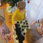 Beszélgettünk arról is, hogy karácsonyra várva takarításba, sütés-főzésbe fog mindenki, hogy az ünnep minél fényesebb és kellemesebb legyen! Megfogadtuk, hogy segítünk a szülőknek, hogy minél több időt tölthessenek együtt a gyerekekkel. Megkértem a szülőket, hogy fényképezzék le, amikor a gyerekeik segítenek nekik és töltsék föl a zárt facebook csoportunkba a képeket. Rengeteg kép érkezett! A gyerekek a csoportban is tovább folytatták a segítségadást. Segítettek egymásnak öltözni-vetkőzni, töltöttek a nagyok a kisebbeknek inni, ha szükségük volt rá, összeszedték a kiborult játékot, és segítettek a dadus néninek is ágyneműt húzni, virágágyást kigazolni. Hála fánkon még soha nem volt ennyi gomb! ( aki segít valakinek, az gombot kap a falevelére) Luca napi búzát is vetettünk, (a maradék búzát a madaraknak adtuk, hogy ne éhezzenek a hideg téli napokon) A búzát együtt öntöztük, elmesélte mindenki a sajátjának, hogy mennyi jót tett aznap ( segítettem Raulnak öltözni, a dadus néninek a virágos kertben…) ennek is köszönhetően növénykéink szépen fejlődtek.