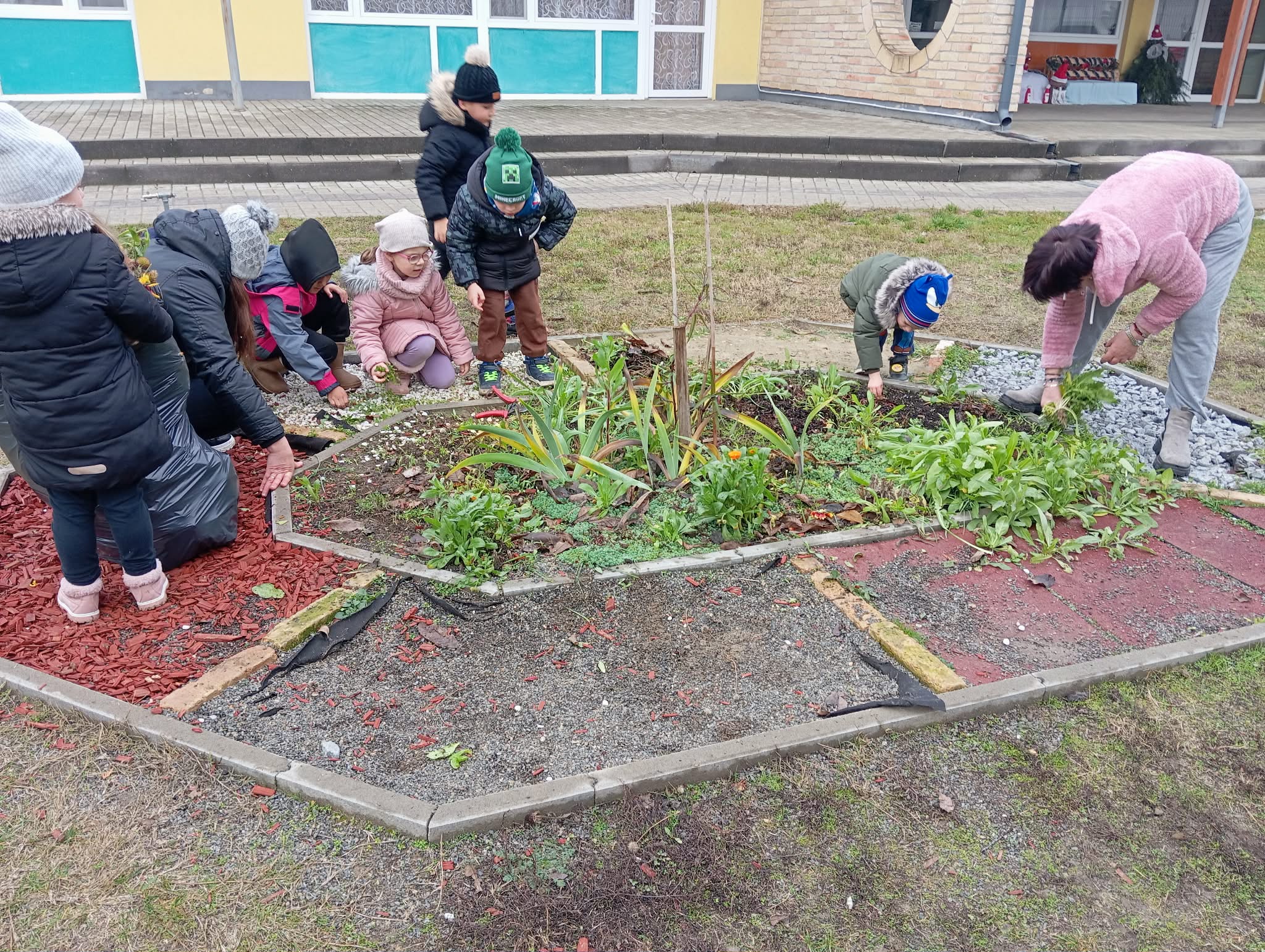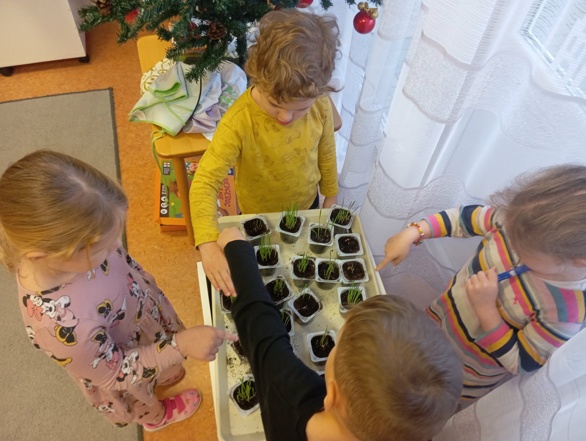 Beszélgettünk arról is, hogy karácsonyra várva takarításba, sütés-főzésbe fog mindenki, hogy az ünnep minél fényesebb és kellemesebb legyen! Megfogadtuk, hogy segítünk a szülőknek, hogy minél több időt tölthessenek együtt a gyerekekkel. Megkértem a szülőket, hogy fényképezzék le, amikor a gyerekeik segítenek nekik és töltsék föl a zárt facebook csoportunkba a képeket. Rengeteg kép érkezett! A gyerekek a csoportban is tovább folytatták a segítségadást. Segítettek egymásnak öltözni-vetkőzni, töltöttek a nagyok a kisebbeknek inni, ha szükségük volt rá, összeszedték a kiborult játékot, és segítettek a dadus néninek is ágyneműt húzni, virágágyást kigazolni. Hála fánkon még soha nem volt ennyi gomb! ( aki segít valakinek, az gombot kap a falevelére) Luca napi búzát is vetettünk, (a maradék búzát a madaraknak adtuk, hogy ne éhezzenek a hideg téli napokon) A búzát együtt öntöztük, elmesélte mindenki a sajátjának, hogy mennyi jót tett aznap ( segítettem Raulnak öltözni, a dadus néninek a virágos kertben…) ennek is köszönhetően növénykéink szépen fejlődtek.