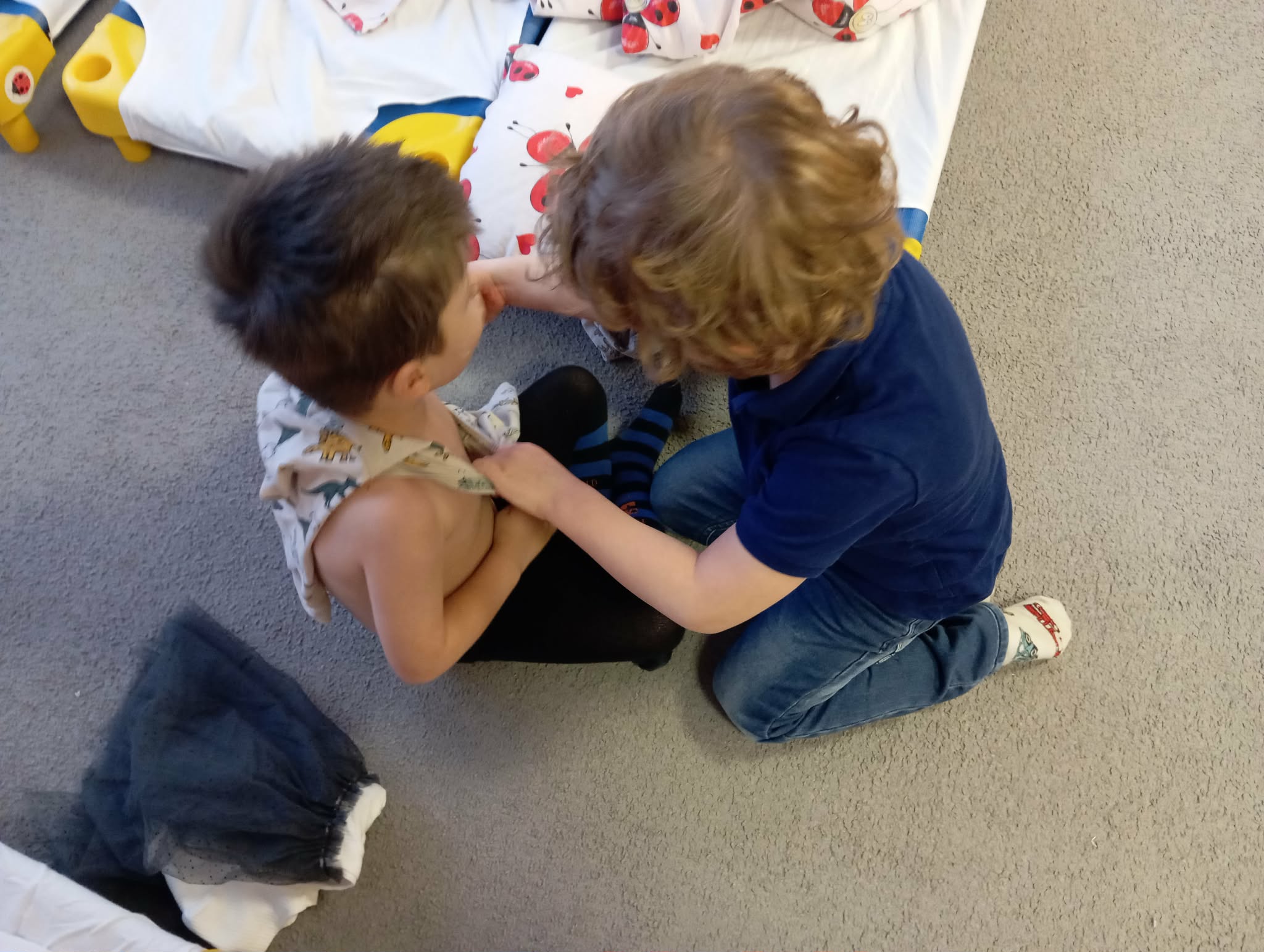 Reggeli körünkben eljátszottuk, hogy buszra szállunk, minden hely foglalt, mikor idős bácsi, néni, anyuka kisgyerekkel száll fel és a gyerekek átadták a helyüket. Később, játékidőben, spontán is játszották ezt a játékot.