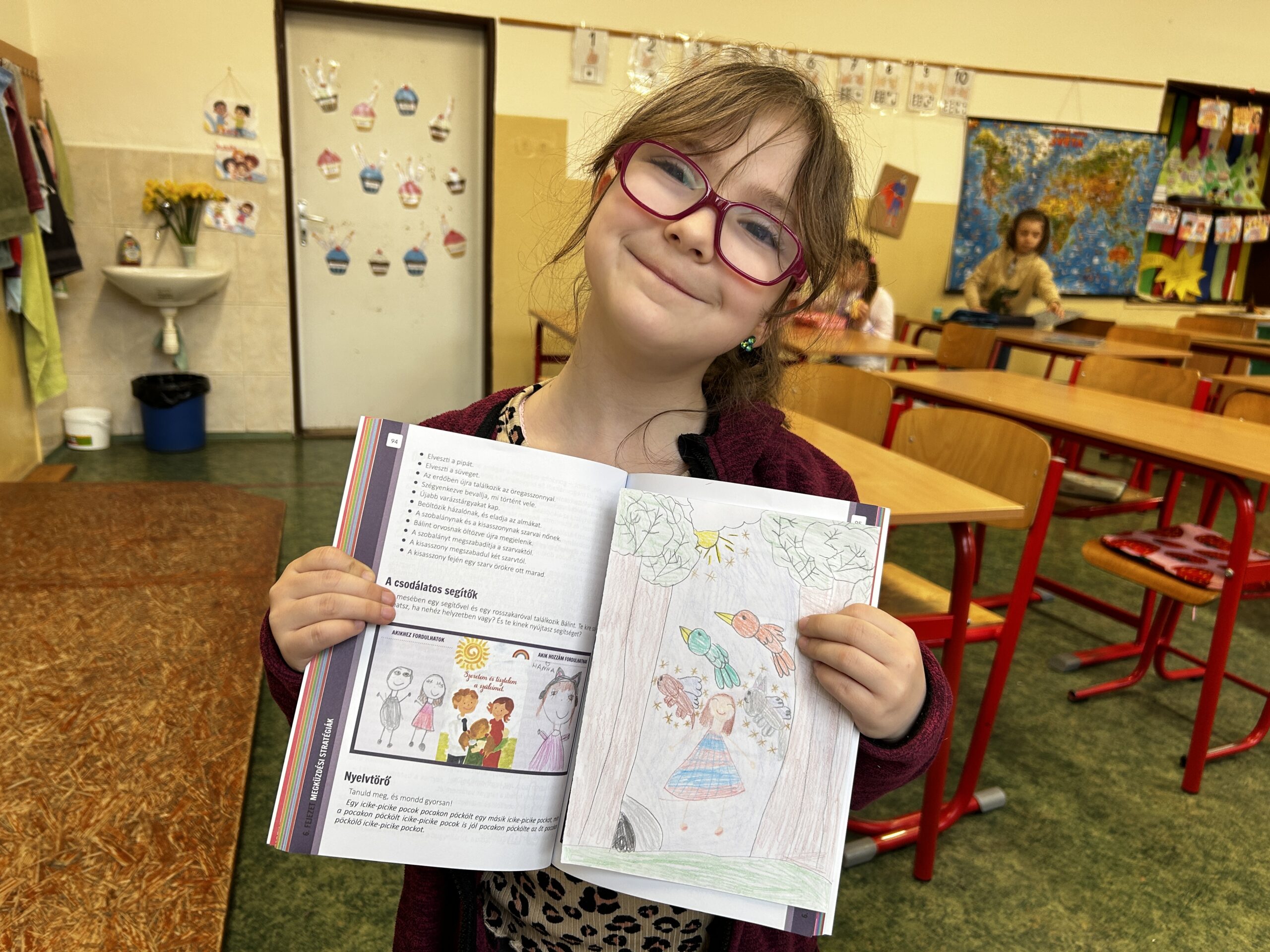 A megküzdési stratégiákból a segítségnyújtásra helyeztük a hangsúlyt, gyakorlatokat csináltunk, amiket párban sokkal könnyebb. A munkafüzetekbe kidolgoztuk a csodálatos segítőink képét. Sokat beszélgettünk arról, milyen nehéz helyzetekbe kerültek a gyerekek és kerestük a megoldásokat, hogyan lehetett volna őket megoldani, ill. hogyan oldották meg az akkori problémát ők. Eljátszottuk a ‘vak kígyó’ játékot, melyben csakis az első gyermek szeme volt nyitva, a többieké behunyva és hagyták magukat vezetni az első által. Nagyon élvezetes játék lett ez a gyerekek számára! Meghallgatták az ‘Öröm forrása’ című mesét és mindenki lerajzolta, ő hogyan képzeli el ezt a forrást és a kislány álmát.