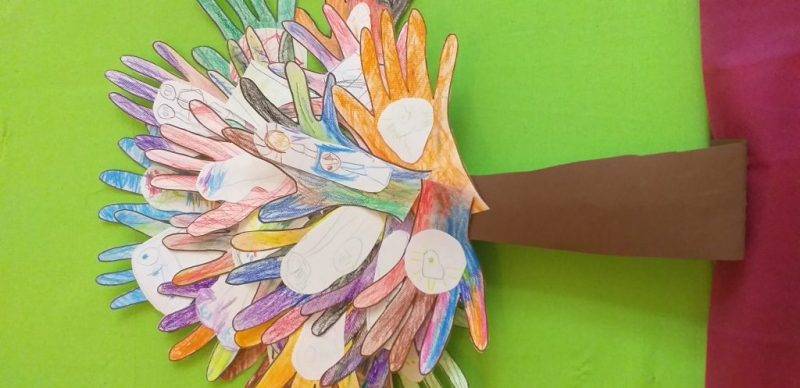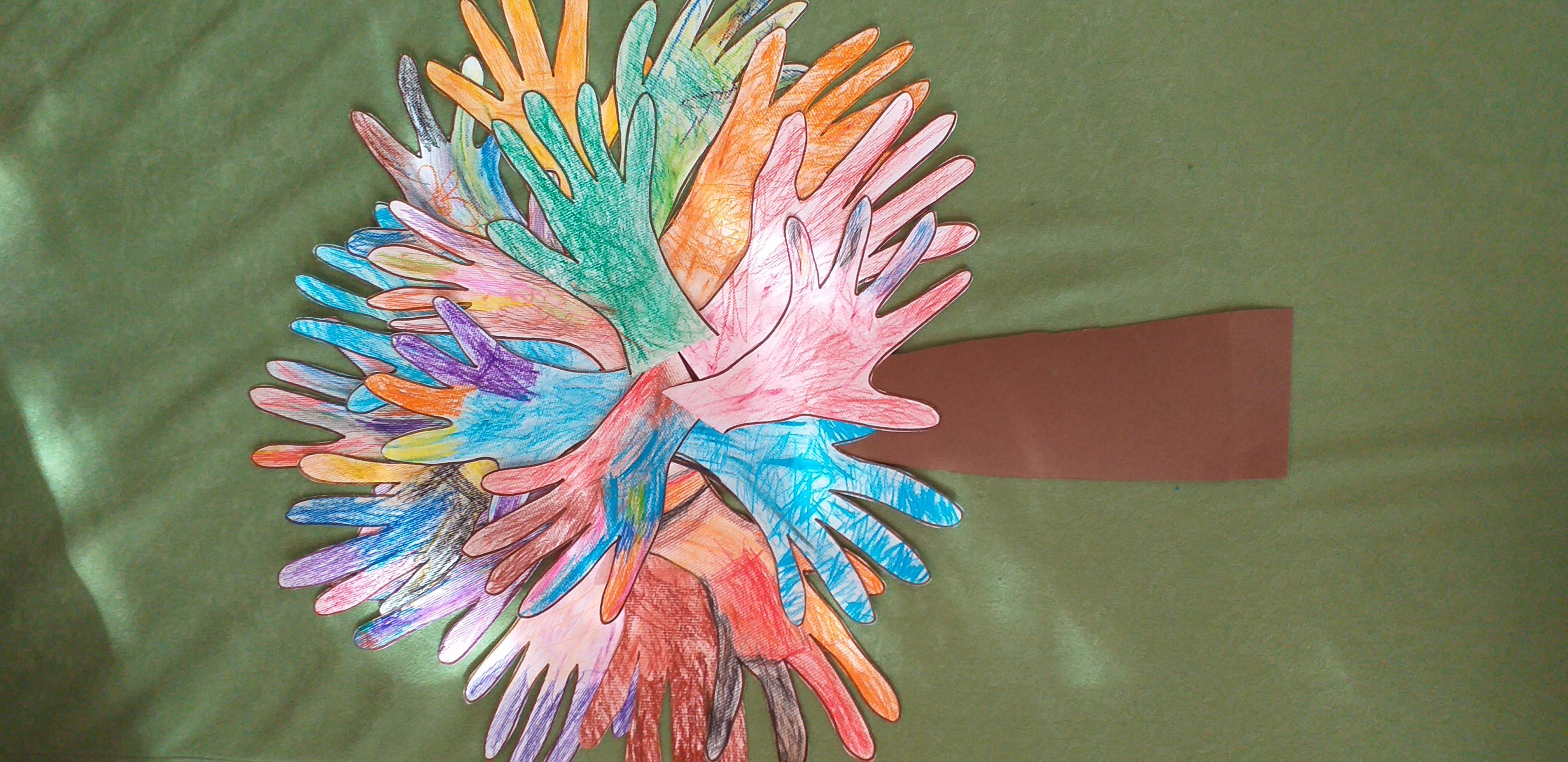 Közösen megalkottuk a fàt amelynek törzse az èn karom mintàjjàròl kèszült,a lombjàt pedig a gyermek munkàkbòl alakìtottam ki. A gyermekek a tenyèr mintàt kiszìneztèk,majd lerajzolta mindenki,hogy mièrt lehetünk hàlàsak.