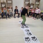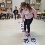 A padlóra ragasztott medvelábnyomokon való végighaladás a részcélok fontosságát jelképezte. Minden egyes ugrás egy-egy magabiztos lépés volt a végcél felé. A játék remekül fejlesztette a nagymozgást és az összpontosítást.
