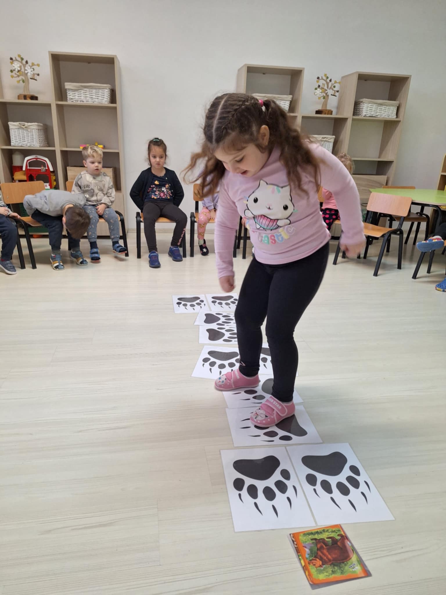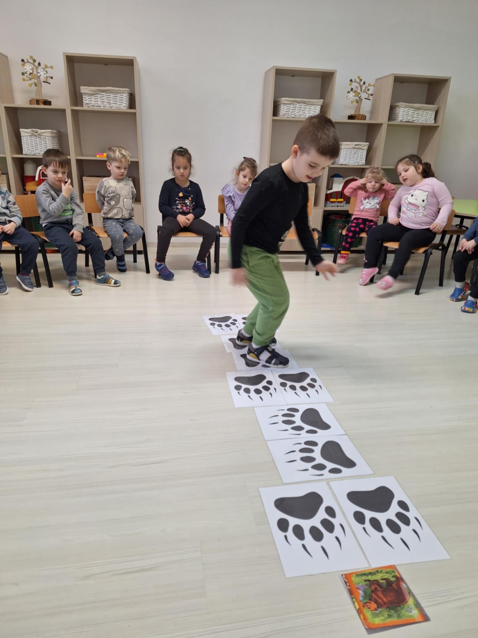 A padlóra ragasztott medvelábnyomokon való végighaladás a részcélok fontosságát jelképezte. Minden egyes ugrás egy-egy magabiztos lépés volt a végcél felé. A játék remekül fejlesztette a nagymozgást és az összpontosítást.