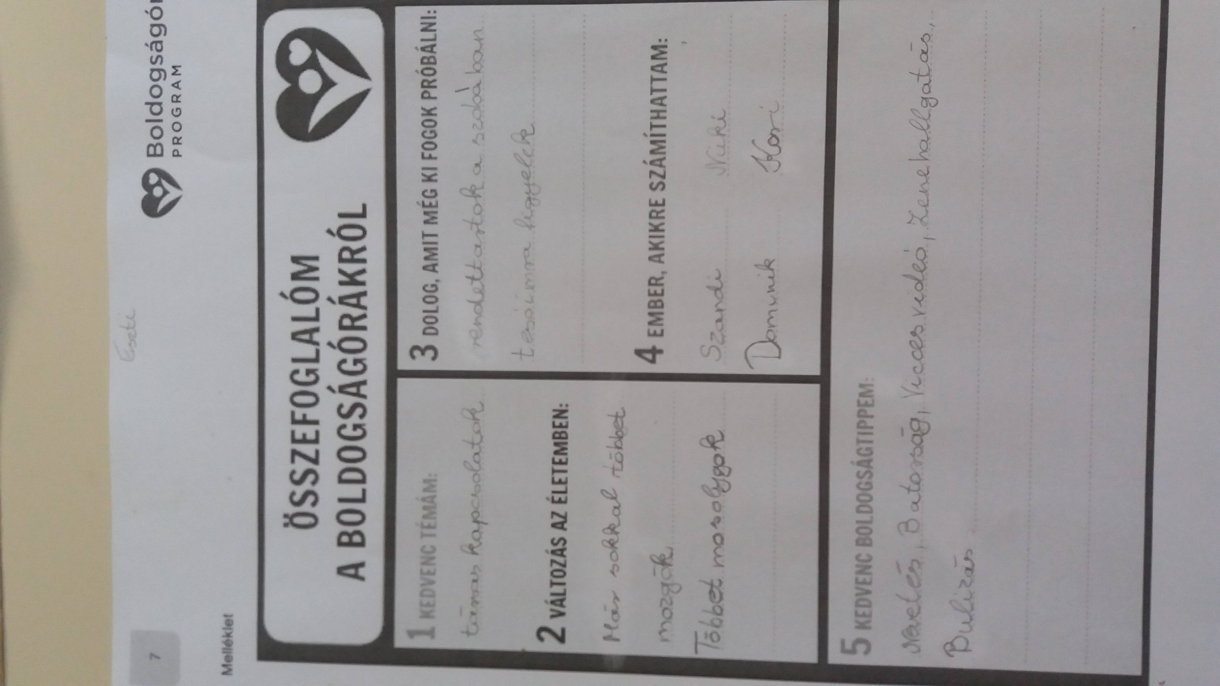 A tanév utolsó boldogságóráján felelevenítettük az elmúlt tíz hónap témáit és a velük kapcsolatos kedves emlékeinket. Összefoglalásként tippeket gyűjtöttünk ahhoz, hogyan tudunk tartósan boldogok lenni.