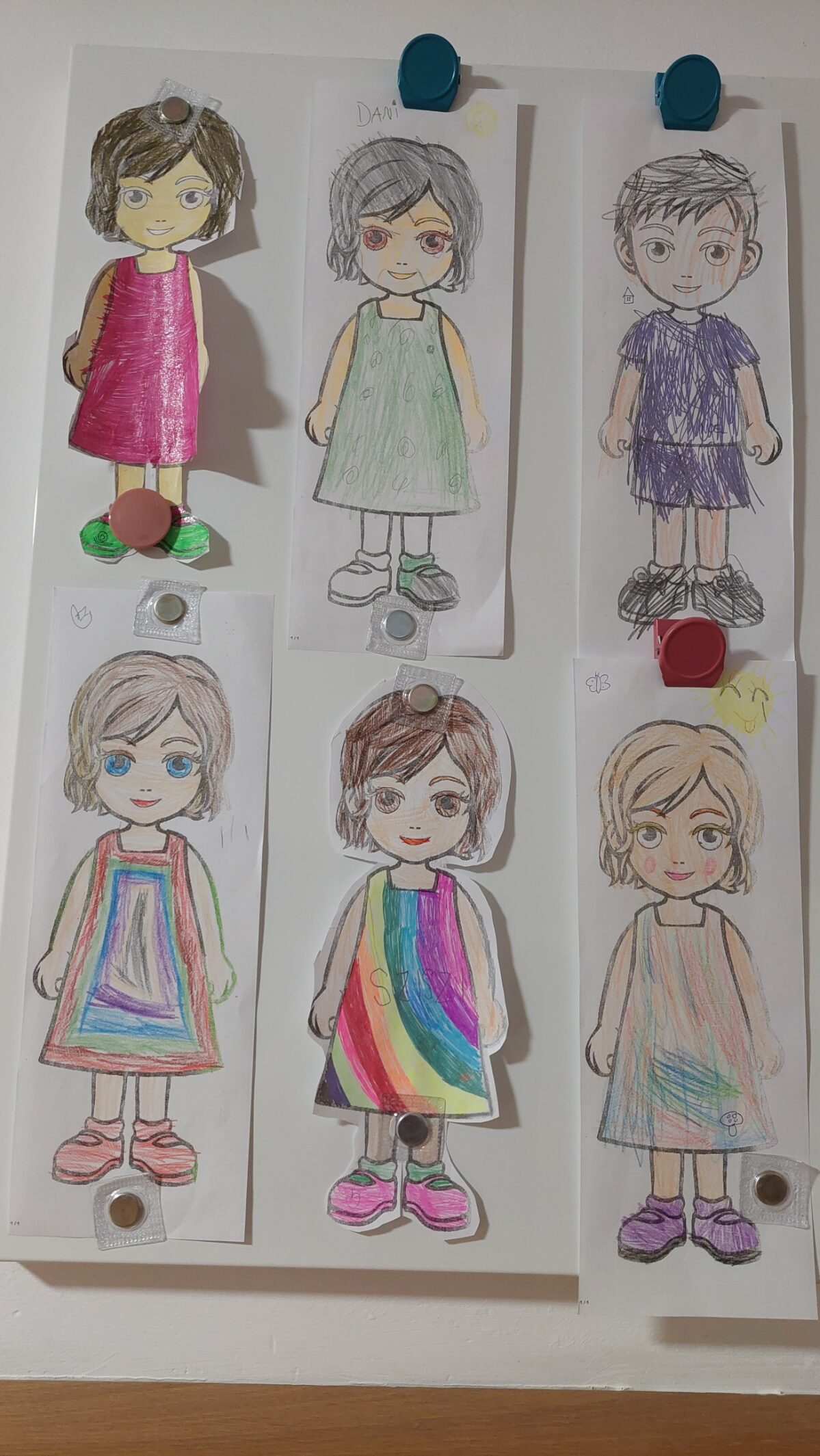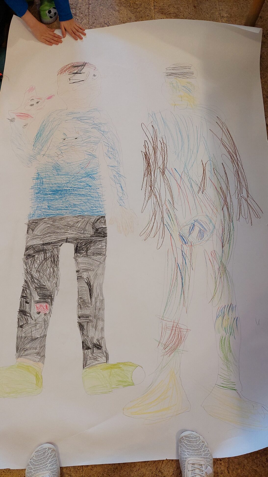 Megint hétfő, lerajzolták egymást a gyerekek nagy papírra, és kiszínezték egymást. Persze itt meg kellett figyelni egymás ruháját, szeme, haja színét, stb. Így jó kis társas kontextus alakult ki. Kijavították egymás munkáját, ötleteket adtak, segítették egymást.