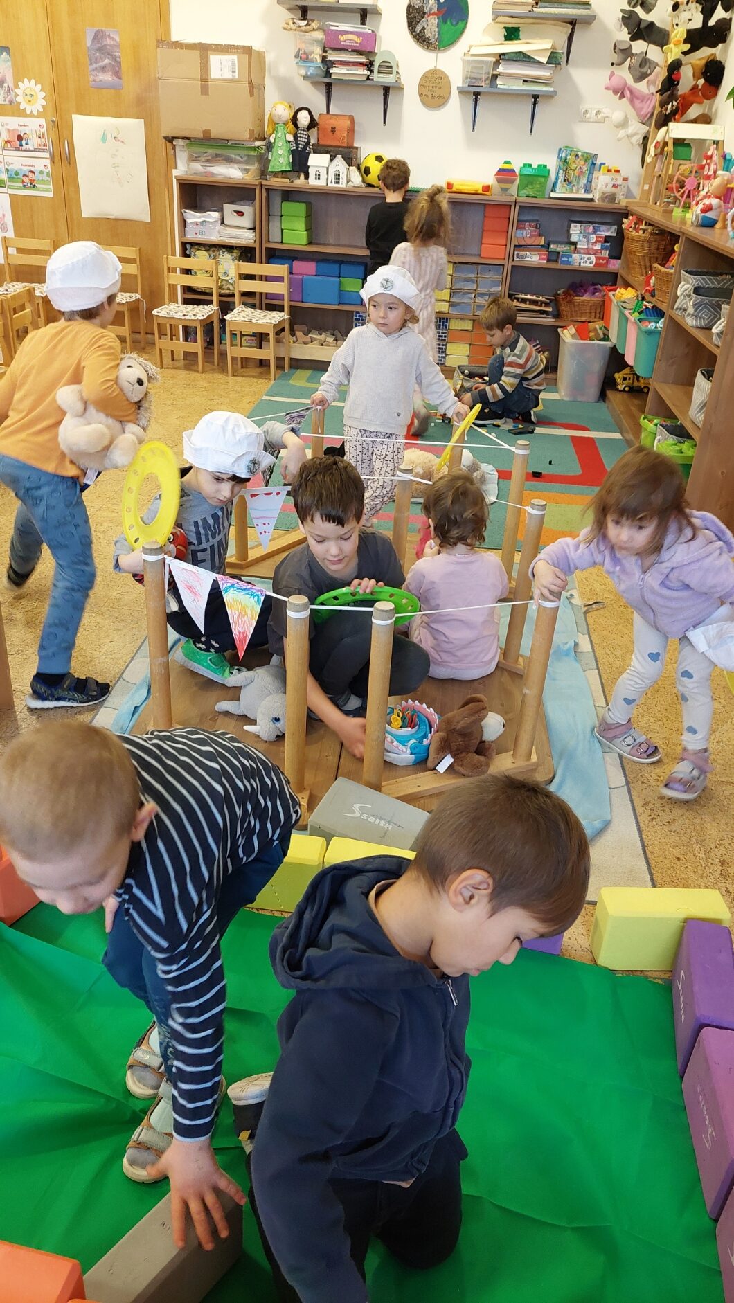 Pillanatkapitányhoz kapcsolódóan hajós játékot kezdeményeztem, ami nagyon tartalmas lett a végén, sokáig játszottak vele a gyerekek, színeztek kiszászlót a hajóra, felfordított asztal adta a hajótestet, és összekötöttük a lakatlan szigettel, tavacskával, és egy kis mindfullness ringatással, vízcsepp csurgással az arcunkon, amit az ugrándozó delfinek csaptak az arcunkba.