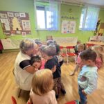 A kiscsoportosok még beszoktatási időszakban vannak. A mesterprogramomnak köszönhetően már ismerősként üdvözöltük egymást a gyerekek többségével, mivel az óvoda- bölcsőde átmenet segítése révén többször találkoztam velük az előző nevelési évben. Így könnyebb a beszoktatás és zökkenőmentesebb a szülőktől való elválás is. Nagy öleléssel kezdtünk és nagy örömömre mindenki odaszaladt hozzám és körbefogtak, átöleltek. Egy kis mozgással kezdtük a Boldogságórát, relaxációs gyakorlatokkal: