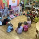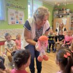 Bagdi Bella: Szép nap ölelj most át engem című dalát ülve hallgattuk. A gyerekek ráéreztek a dal hangulatára, mert figyelmesen csendben hallgatták és a végén már egy páran énekelték is a dalt. Amikor a végére értünk, kérték, hogy hallgathassák újra:” – még egyszer!” kiáltották kórusban. A mesénk, Lukács Elvira: A hálás kisfecske című mese volt. Aktuális az ősz kapcsán, hiszen a költöző madaraink már útrakészen állnak, hogy melegebb helyre költözzenek, mire eljön a tél. „Boldog Dóra”, a kislány báb volt a segítőm a mesélésben.