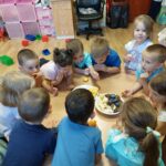 Észrevehető a gyermekeken, hogy bölcsődébe jártak, mert próbálták a felnőtt mozgását utánozni. Ügyesek voltak és visszamosolyogtak rám! Megdicsértem őket, amiért ilyen ügyesen tornáztak velem! A héten gyümölcs hetünk is van és a szülők nagyon sok őszi gyümölcsöt hoztak. Megnéztük, megtapintottuk, megbeszéltük a színét, a formáját, a méretét, azután illatoztuk, majd a tevékenység végén meg is kóstoltuk. Édes, vagy savanyú? Ki melyiket szerette. Hálásak voltunk ezekért a gyümölcsökért! Olyan sok volt, hogy kitartott egész héten keresztül, így minden nap tudtunk finomságot enni, ami ráadásul egészséges is.
