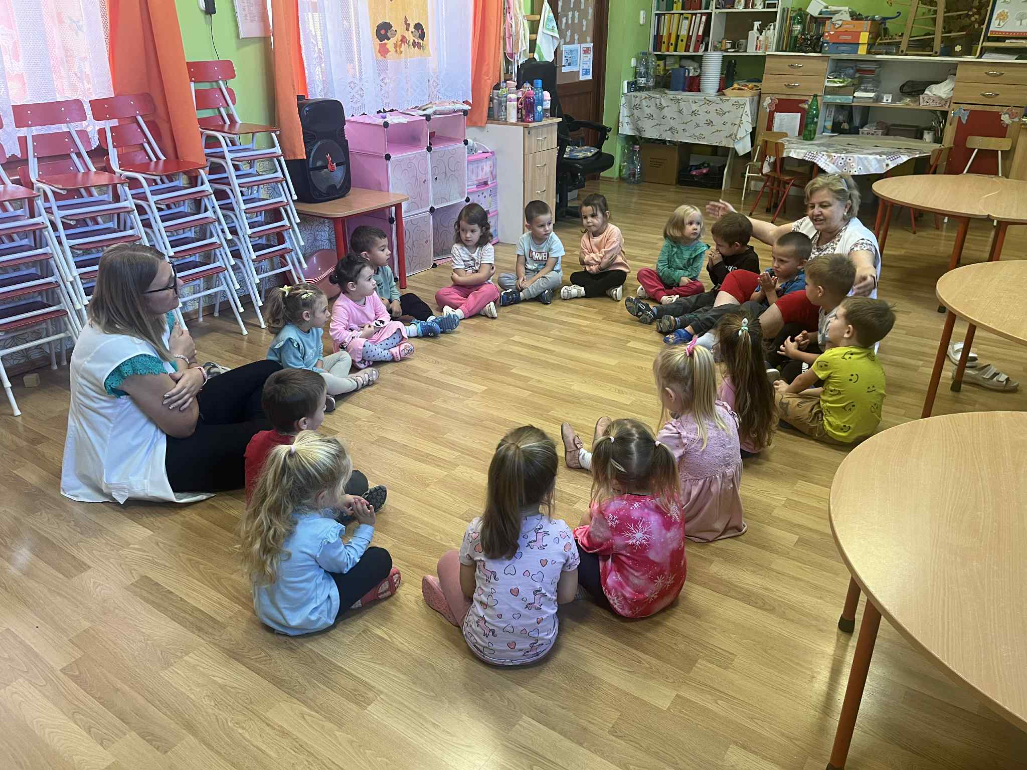 A kiscsoportosok még beszoktatási időszakban vannak. A mesterprogramomnak köszönhetően már ismerősként üdvözöltük egymást a gyerekek többségével, mivel az óvoda- bölcsőde átmenet segítése révén többször találkoztam velük az előző nevelési évben. Így könnyebb a beszoktatás és zökkenőmentesebb a szülőktől való elválás is. Nagy öleléssel kezdtünk és nagy örömömre mindenki odaszaladt hozzám és körbefogtak, átöleltek. Egy kis mozgással kezdtük a Boldogságórát, relaxációs gyakorlatokkal: