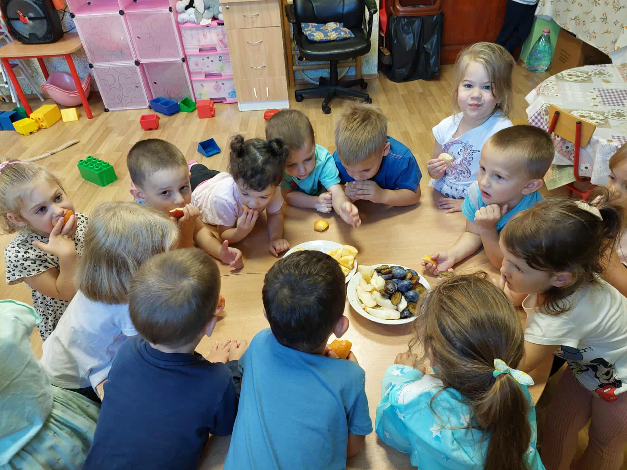 Észrevehető a gyermekeken, hogy bölcsődébe jártak, mert próbálták a felnőtt mozgását utánozni. Ügyesek voltak és visszamosolyogtak rám! Megdicsértem őket, amiért ilyen ügyesen tornáztak velem! A héten gyümölcs hetünk is van és a szülők nagyon sok őszi gyümölcsöt hoztak. Megnéztük, megtapintottuk, megbeszéltük a színét, a formáját, a méretét, azután illatoztuk, majd a tevékenység végén meg is kóstoltuk. Édes, vagy savanyú? Ki melyiket szerette. Hálásak voltunk ezekért a gyümölcsökért! Olyan sok volt, hogy kitartott egész héten keresztül, így minden nap tudtunk finomságot enni, ami ráadásul egészséges is.