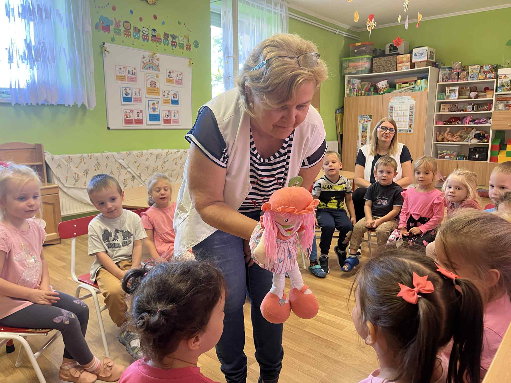 Bagdi Bella: Szép nap ölelj most át engem című dalát ülve hallgattuk. A gyerekek ráéreztek a dal hangulatára, mert figyelmesen csendben hallgatták és a végén már egy páran énekelték is a dalt. Amikor a végére értünk, kérték, hogy hallgathassák újra:” – még egyszer!” kiáltották kórusban. A mesénk, Lukács Elvira: A hálás kisfecske című mese volt. Aktuális az ősz kapcsán, hiszen a költöző madaraink már útrakészen állnak, hogy melegebb helyre költözzenek, mire eljön a tél. „Boldog Dóra”, a kislány báb volt a segítőm a mesélésben.