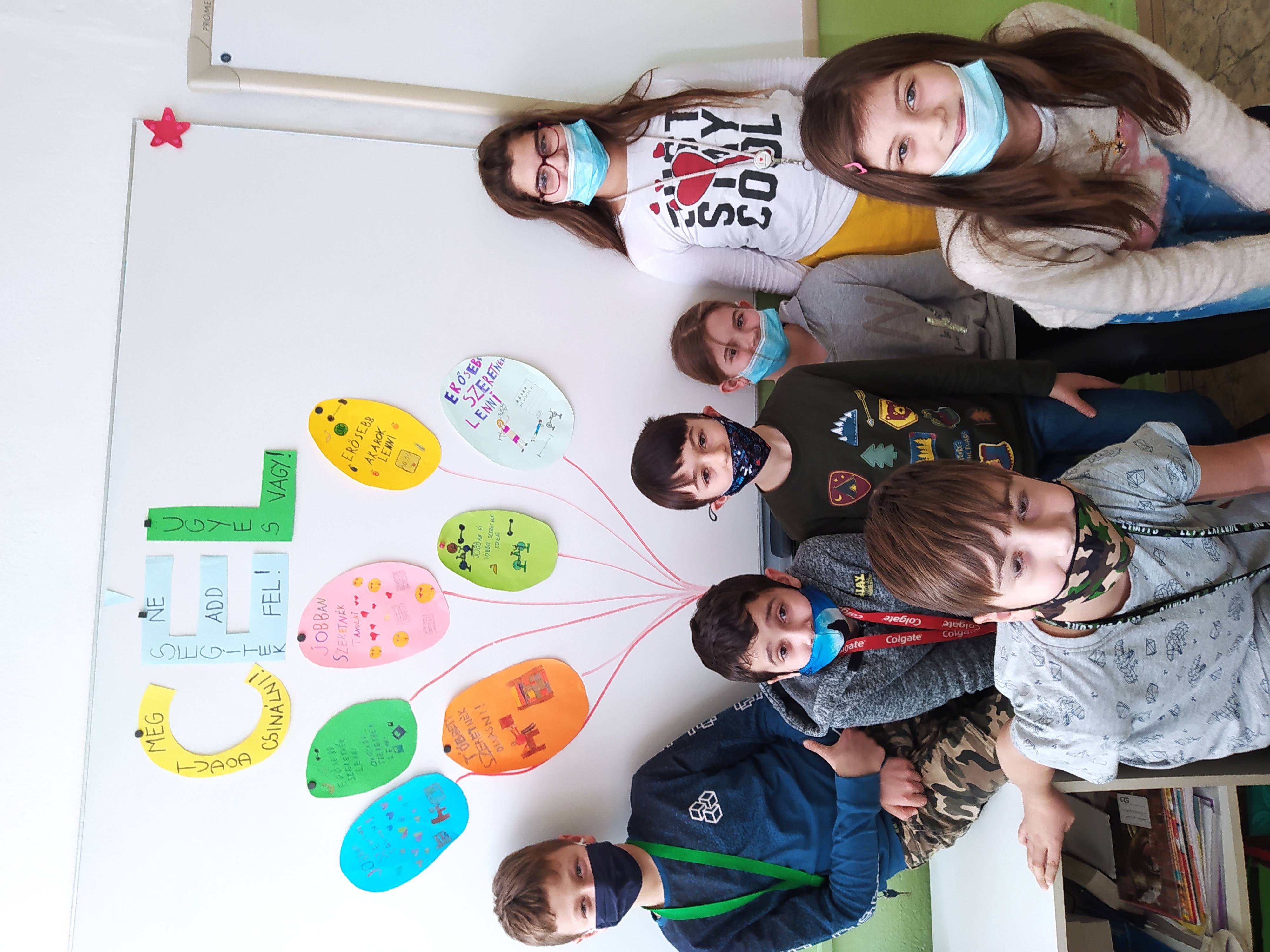 Az e havi téma feldolgozását nem egy órán valósítottuk meg, hanem a hónap folyamán többször foglalkoztunk vele. Januárban a félév értékelése, a jegyek lezárása jó alkalom volt arra, hogy a gyerekekkel minél többet beszélgessünk a célokról a jövőre nézve. A másik alkalom a természetismereti óra volt, mivel a tananyag kapcsán – amely a keringési rendszer, ezen belül a szív működése – a szívünk egészségének megőrzéséről, a sport fontosságáról beszélgettünk. Talán ezért is a célok megfogalmazásánál a gyerekek ezt a két területet dolgozták fel. Néhányan jobb eredményeket szeretnének elérni a következő félévben, a többiek a sport terén szeretnének jobbak lenni. A gyerekek a konkrét céljaikat megfogalmazták, egy papírlufira rajzolták, illetve leírták. A táblára kiraktuk a lufikat, melyek a szállnak a cél felé. Néhány segítő gondolatot is felírtunk a célok eléréséhez: Ne add fel! Meg tudod csinálni! Ügyes vagy! Segítek!