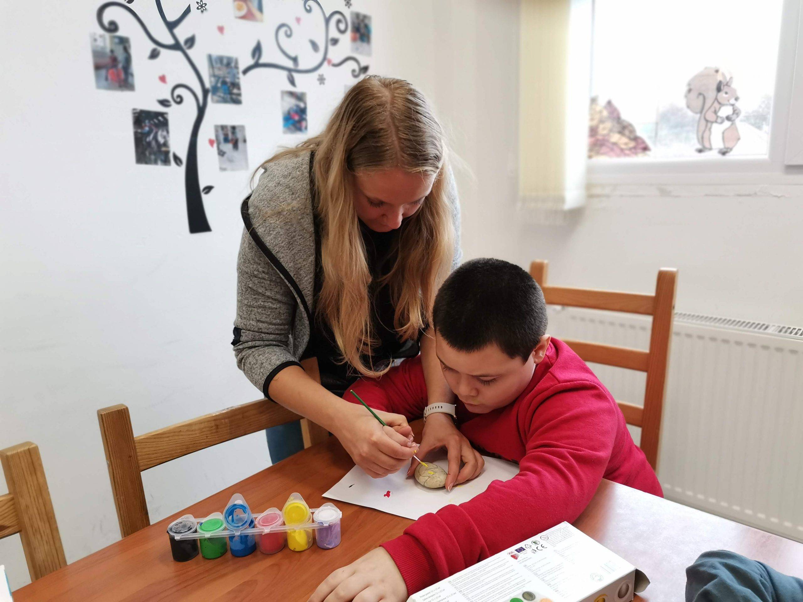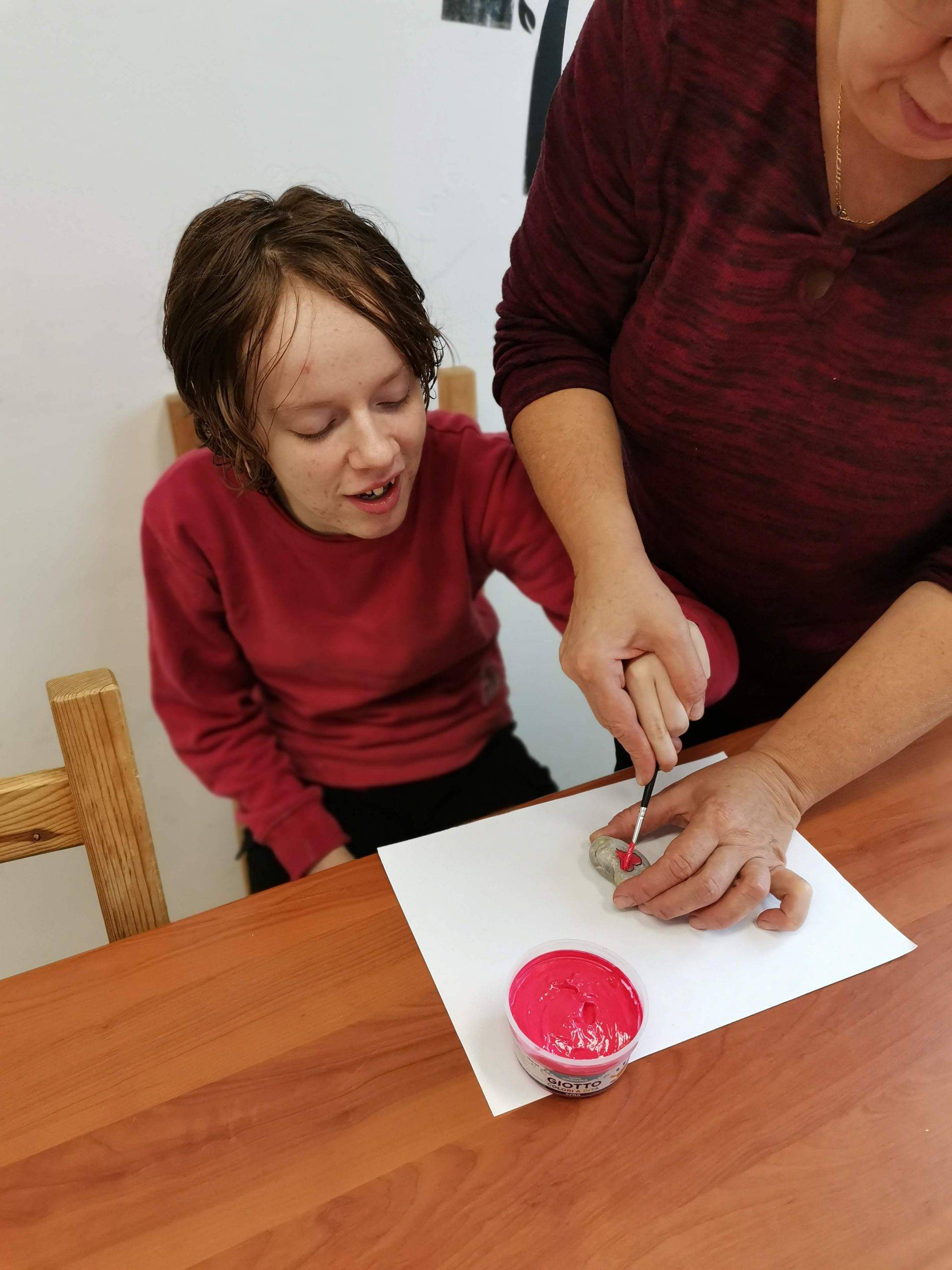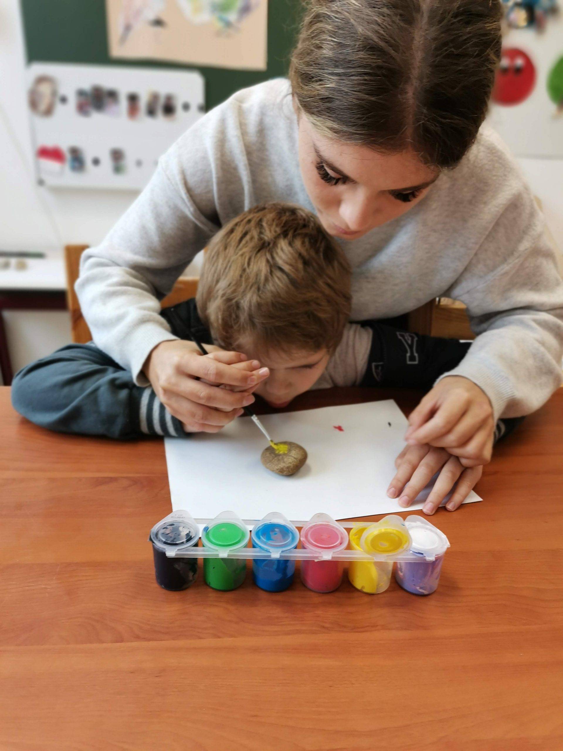 A Süni csoport a Kiskunhalasi Református EGYMI súlyosan-halmozottan fogyatékos tanulókat nevelő-oktató intézményének autista, autisztikus tünetekkel rendelkező nem beszélő gyermekekből álló csoportja. A csoportba 5 tanuló jár, 1 lány és 4 fiú, 7-18 éves kor között. Én pedagógusként már korábban is tartottam Boldogságórákat, viszont ez csoport e tanévtől csatlakozott a programhoz, tehát nagy újdonságot hozott a mi mindennapjainkba. Képességeinkhez mérten igyekszünk majd megoldani minden hónapban a feladatokat. Úgy gondolom, hogy ebben a témában sikeresen vettük az “akadályt”. Meghallgattuk a hónap dalát, és elolvastam a tanulóknak a hónap meséjét is, majd beszélgettünk róla. Az időjárás sajnos nem volt kegyes hozzánk szeptemberben, de végül egy kevésbé borús napon sikerült együtt köveket gyűjtenünk egy séta alkalmával. Majd képek segítségével megbeszéltük a tanulókkal, hogy ki miért hálás, és ezek közül választottunk egyet, amit mindenki felfestett a saját hála kövére. A tanulók a következőket választották: zene, nasi, napsütés, játék, hinta. Mi felnőttek pedig a természetet és a szeretetet festettük fel a kövekre. Az egészet mosoly formában rendeztük el, mert egy nagyon jó kedvű csapat vagyunk, és ezért is hálásak lehetünk. Mi nagyon jól éreztük magunkat a feladat készítése közben. Remélem mindenki másnak is tetszeni fog az alkotásunk.