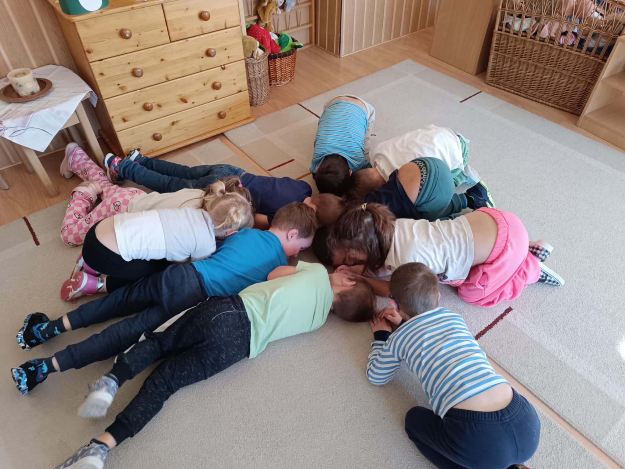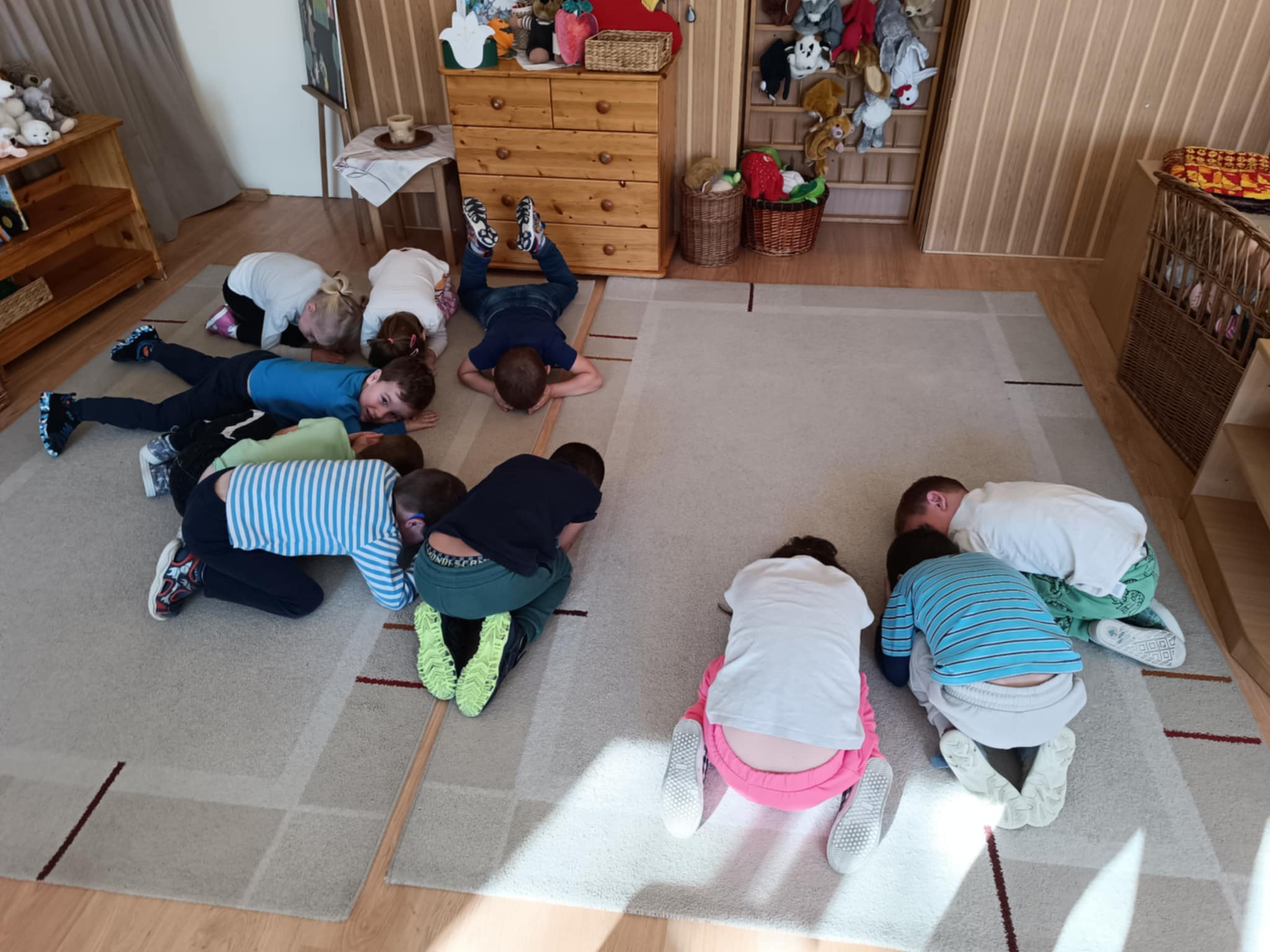 „Helyezkedjetek el a szőnyegen szétszórtan, egymástól távolabb. Csendesedjetek el, vegyetek néhány nagy levegőt. Most képzeljétek el, hogy erdei állatok vagytok az őszi avarban. Hogyan mozognak, hogyan szuszognak a kisállatok? Hagyjátok, hogy a testetek állatkaként mozgolódjon. Egyelőre egyedül matattok, élvezitek a falevelek simogatását és a meleg talajt. Nagyon szeretitek az őszt, ami sok finom táplálékot ad nektek. Most közeledjetek egymáshoz, és lassacskán alkossatok egy nagy állatkupacot! Szeretnek az állatkák egymáshoz dörgölőzni? Ha jön a hűvös este, összebújnak, és úgy melegítik egymást! Kicsit forgolódnak is… És sustorognak! Mit gondoltok miről mesélnek egymásnak?
