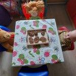 A mozgásos dalos játékot a tornaszobában játszottuk el. Ügyesen megtanulták a szöveget, megértették a szabályt. Biztos, kedvelt, dalos játékukká válik a „Kecske-becske mit csinálsz?” című játék. Ezt összekötöttük az „A part alatt” című dal éneklésével, és a dal szövegének megfelelően mozogtunk, eljátszottuk a dalt. Előtte felelevenítettük a „Kicsi dió” című mesét. Megbeszéltük,hogy a cipó ugyanúgy készül, mint a kenyér. Gyurmából készítettünk is kiscipót, amit a későbbiekben a gyermekek a babakonyhában felhasználtak szerepjátékaik során.
