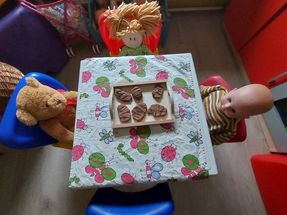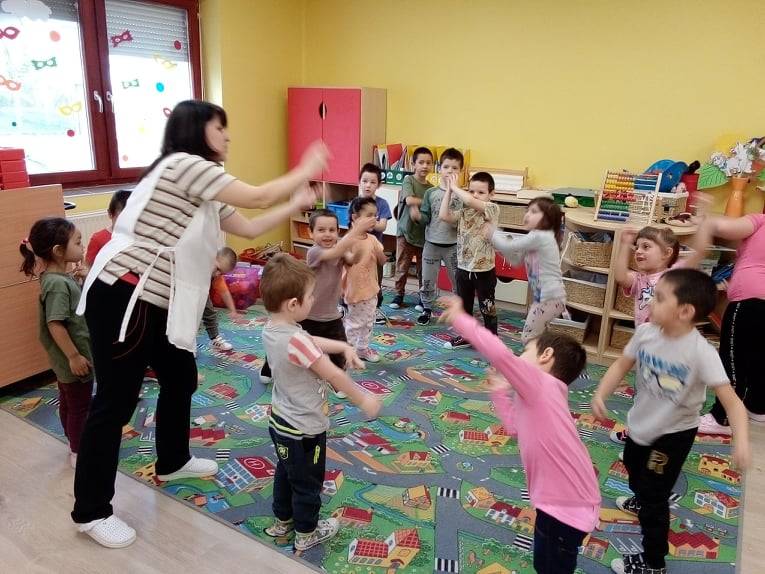 A mozgásos dalos játékot a tornaszobában játszottuk el. Ügyesen megtanulták a szöveget, megértették a szabályt. Biztos, kedvelt, dalos játékukká válik a „Kecske-becske mit csinálsz?” című játék. Ezt összekötöttük az „A part alatt” című dal éneklésével, és a dal szövegének megfelelően mozogtunk, eljátszottuk a dalt. Előtte felelevenítettük a „Kicsi dió” című mesét. Megbeszéltük,hogy a cipó ugyanúgy készül, mint a kenyér. Gyurmából készítettünk is kiscipót, amit a későbbiekben a gyermekek a babakonyhában felhasználtak szerepjátékaik során.