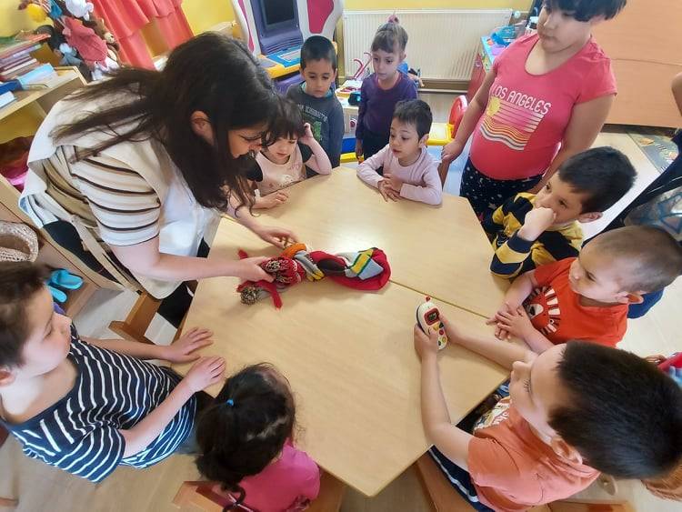A mozgásos dalos játékot a tornaszobában játszottuk el. Ügyesen megtanulták a szöveget, megértették a szabályt. Biztos, kedvelt, dalos játékukká válik a „Kecske-becske mit csinálsz?” című játék. Ezt összekötöttük az „A part alatt” című dal éneklésével, és a dal szövegének megfelelően mozogtunk, eljátszottuk a dalt. Előtte felelevenítettük a „Kicsi dió” című mesét. Megbeszéltük,hogy a cipó ugyanúgy készül, mint a kenyér. Gyurmából készítettünk is kiscipót, amit a későbbiekben a gyermekek a babakonyhában felhasználtak szerepjátékaik során.