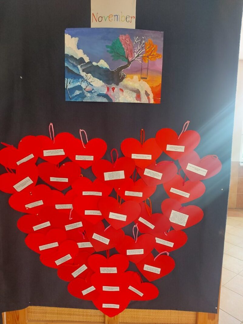 Az óra végén elolvasgattuk az aulába elhelyezett szívhez szóló idézeteket, amelyeket boldogságos kolléganőm készített alsós gyerekekkel – törődve mindenki lelkével.
