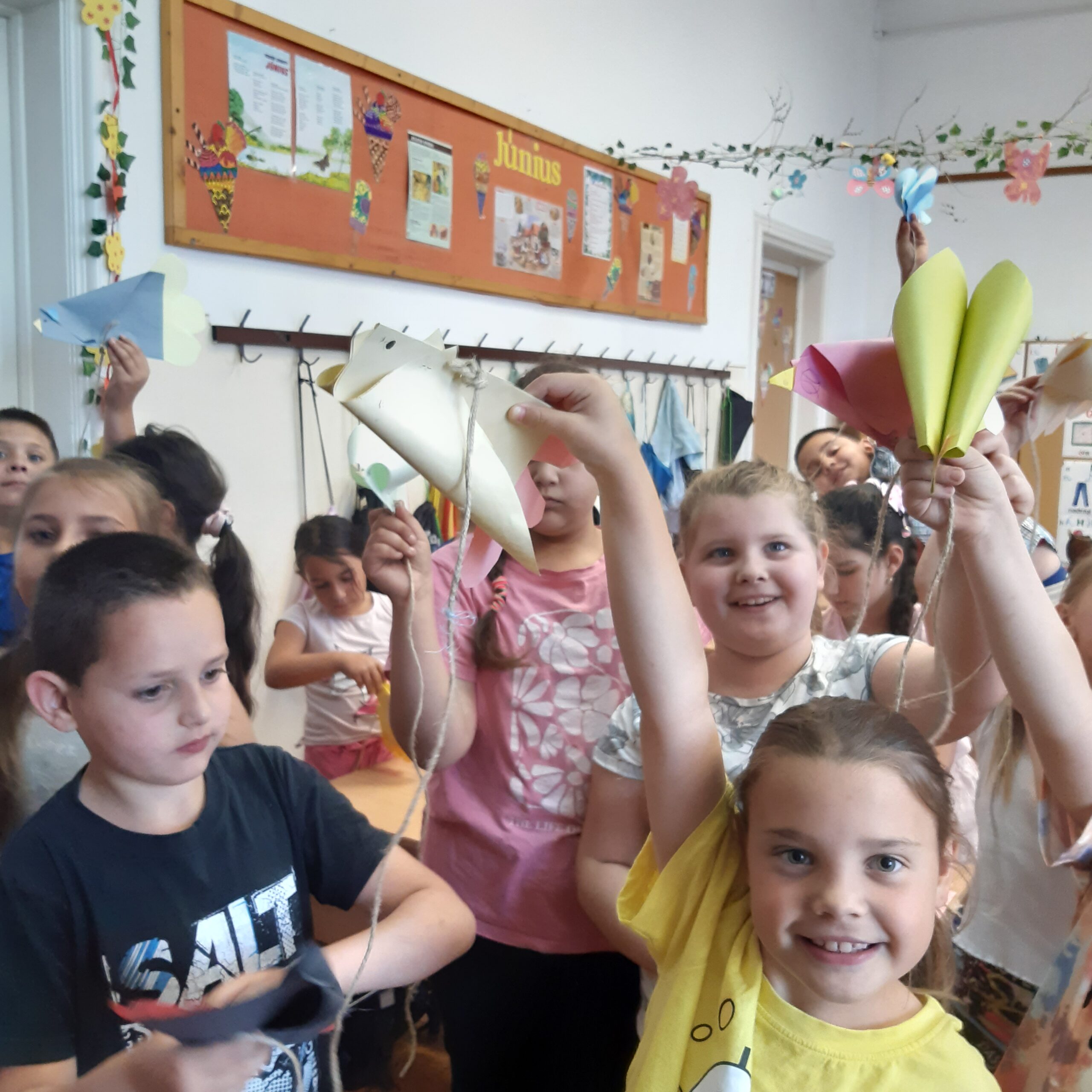 A tanév utolsó hetei gyorsan elröppentek. A foglalkozásokon felidéztük kedvenc játékainkat, meséinket. A Szívmanó kártyák segítségével légzőgyakorlatokat végeztünk, és énekeltünk, táncoltunk Bagdi Bella zenéire. Természetesen a kézműves foglalkozás sem maradt el. Papírmadarat készítettünk, majd az udvaron meg is reptettük őket. Ezzel jelképeztük a közeledő nyári szünetben megvalósuló szabad szárnyalásunkat.