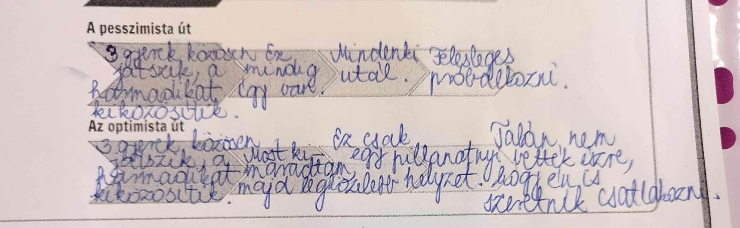 A gyerekekkel kitaláltunk egy szituációt, ami a mindennapokban megesik velük. Három gyerek közösen játszik, a harmadikat kiközösítik. Megnéztük, eljátszottuk a pesszimista és az optimista gondolkodásmódok változatait a szituációra.