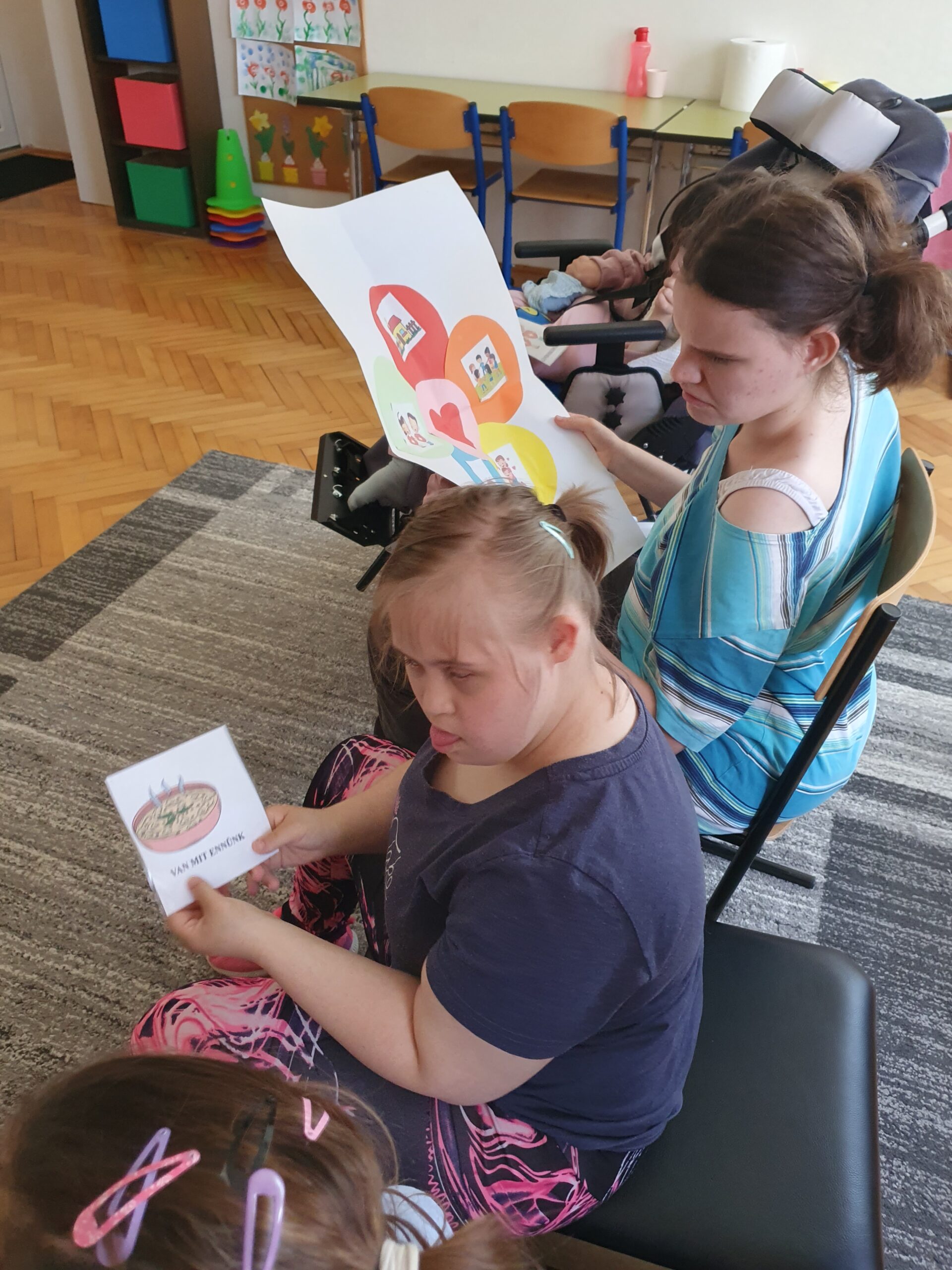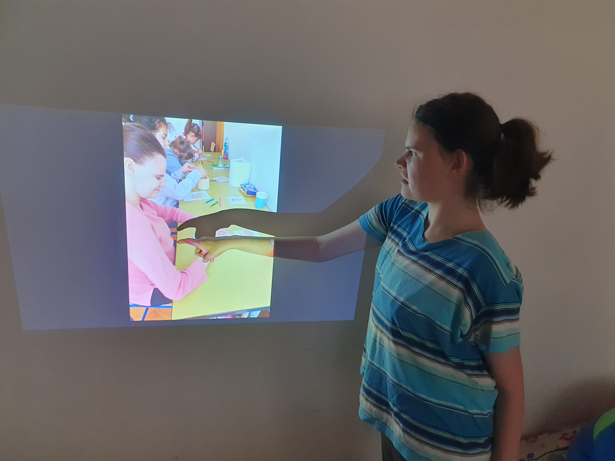 Ezt követően kivetítőn megtekintettük a boldogságórákon készült fotókat, megnézegettük az alkalmazott tárgyképeket, és hozzá felelevenítettük a gesztusjeleket. Az órákon közösen készített képeket, tárgyakat is sorra és kézbe vettük.