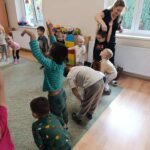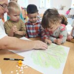 A foglalkozás Bagdy Emőke relaxációs gyakorlatával kezdtük. Szomorú Szilárd és Boldog Bianka smileval erősítettük meg, hogy mikor is vagyunk szomorúak és mikor is vagyunk vidámak, mikor milyen formát vesz fel az arcunk, mimikánk. A játék nagyon humorosra sikerült, hiszen ahhoz, hogy mit szükséges tenni, hogy a szomorú, elkeseredett emberből vidámat varázsoljunk, az a gyermekek körében egy-egy arcforma felvételével valósult meg, amelyen mindenki nagyokat mosolygott, hisz vicces volt. Meghallgathatták Tódi törpe varázsszemüvege meséjét, amely után több nagycsoportos korú gyermek is képes volt megfogalmazni, hogy mi is a tanulsága a mesének. A mesét követve mi is felvettük a képzeletbeli varázsszemüveget és elmondtuk egymás után, hogy mi a mai napon és pont ebben a percben minek is örülünk, i is tesz minket boldoggá. érdekes megfogalmazások jöttek, volt kisgyermek aki az anyukája okozza a legnagyobb örömet, míg az ablakon való kinézését követve a szép őszi fák látványa okozott örömet, míg valakinek a finom gyümölcs megnevezése….stb. Ha már a szép őszi fa látványa is örömet okozott, így elkészítettük a mi közös fánkat és arra felhelyezésre került a gyermekek által megfogalmazott örömforrás. Nagyon gazdag fánk lett, hisz rengeteg minden került fel a tetejébe.