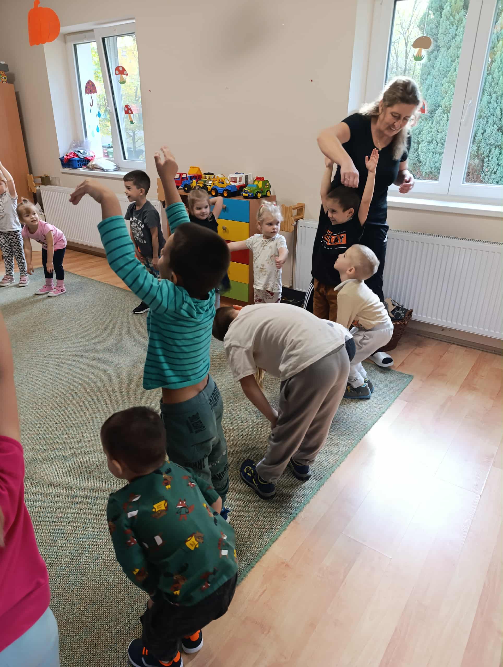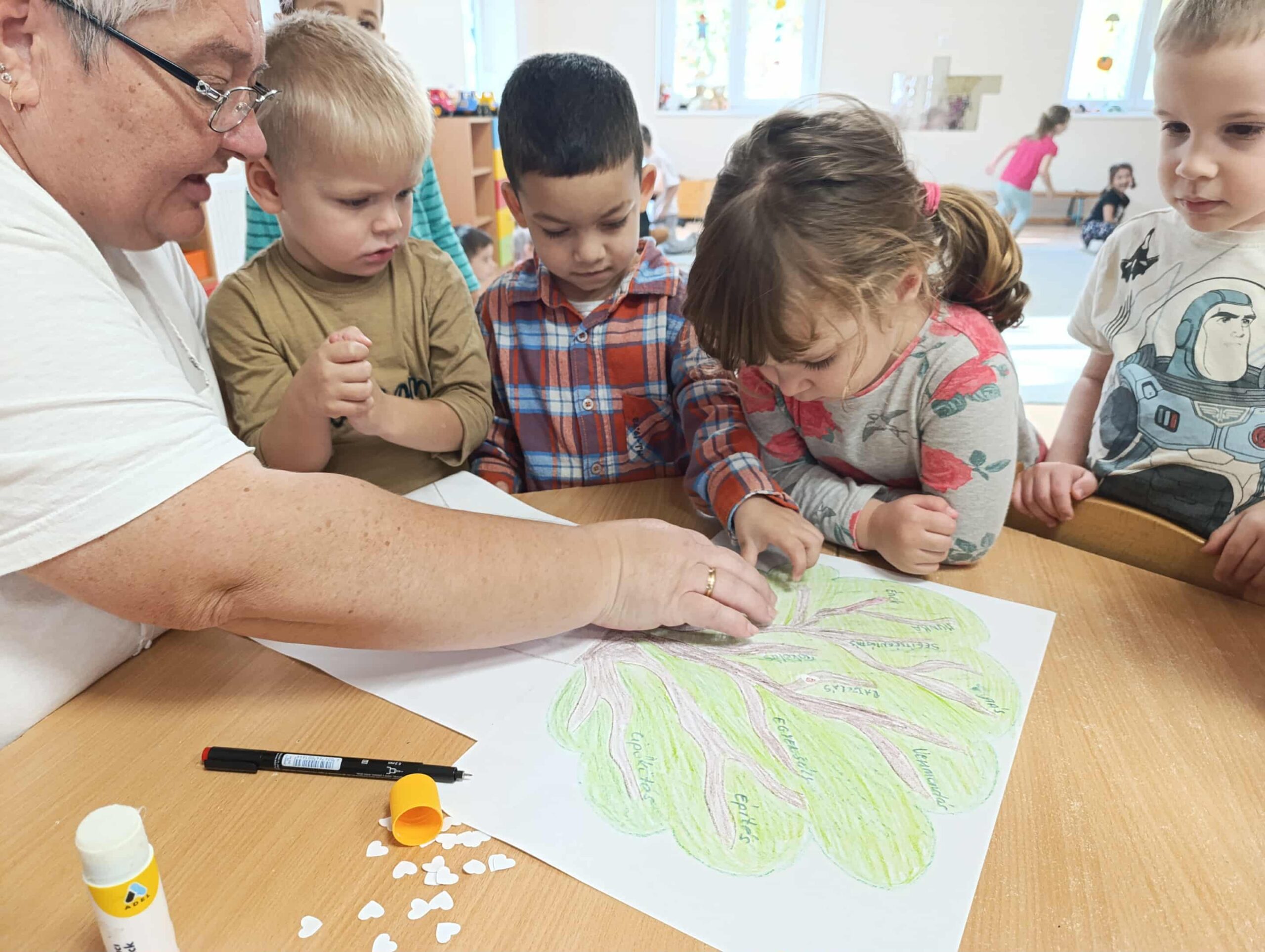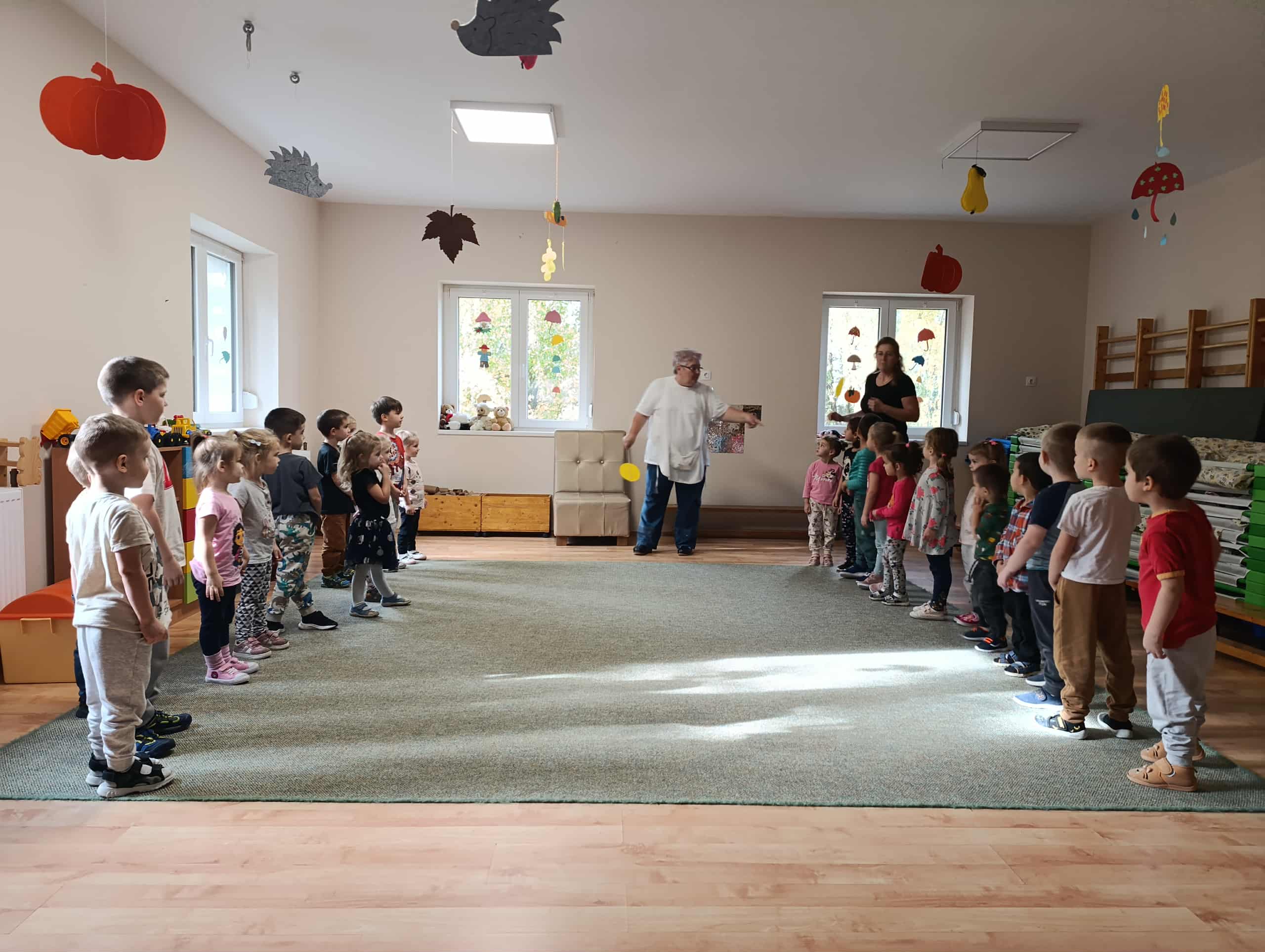 A foglalkozás Bagdy Emőke relaxációs gyakorlatával kezdtük. Szomorú Szilárd és Boldog Bianka smileval erősítettük meg, hogy mikor is vagyunk szomorúak és mikor is vagyunk vidámak, mikor milyen formát vesz fel az arcunk, mimikánk. A játék nagyon humorosra sikerült, hiszen ahhoz, hogy mit szükséges tenni, hogy a szomorú, elkeseredett emberből vidámat varázsoljunk, az a gyermekek körében egy-egy arcforma felvételével valósult meg, amelyen mindenki nagyokat mosolygott, hisz vicces volt. Meghallgathatták Tódi törpe varázsszemüvege meséjét, amely után több nagycsoportos korú gyermek is képes volt megfogalmazni, hogy mi is a tanulsága a mesének. A mesét követve mi is felvettük a képzeletbeli varázsszemüveget és elmondtuk egymás után, hogy mi a mai napon és pont ebben a percben minek is örülünk, i is tesz minket boldoggá. érdekes megfogalmazások jöttek, volt kisgyermek aki az anyukája okozza a legnagyobb örömet, míg az ablakon való kinézését követve a szép őszi fák látványa okozott örömet, míg valakinek a finom gyümölcs megnevezése….stb. Ha már a szép őszi fa látványa is örömet okozott, így elkészítettük a mi közös fánkat és arra felhelyezésre került a gyermekek által megfogalmazott örömforrás. Nagyon gazdag fánk lett, hisz rengeteg minden került fel a tetejébe.