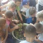 A szüretet egy pajtásunk családjának kertjében végeztük, a szőlő levágásában, a szemezgetésben, a darálás és préselés teljes folyamatában aktívan vettek részt a gyermekek.