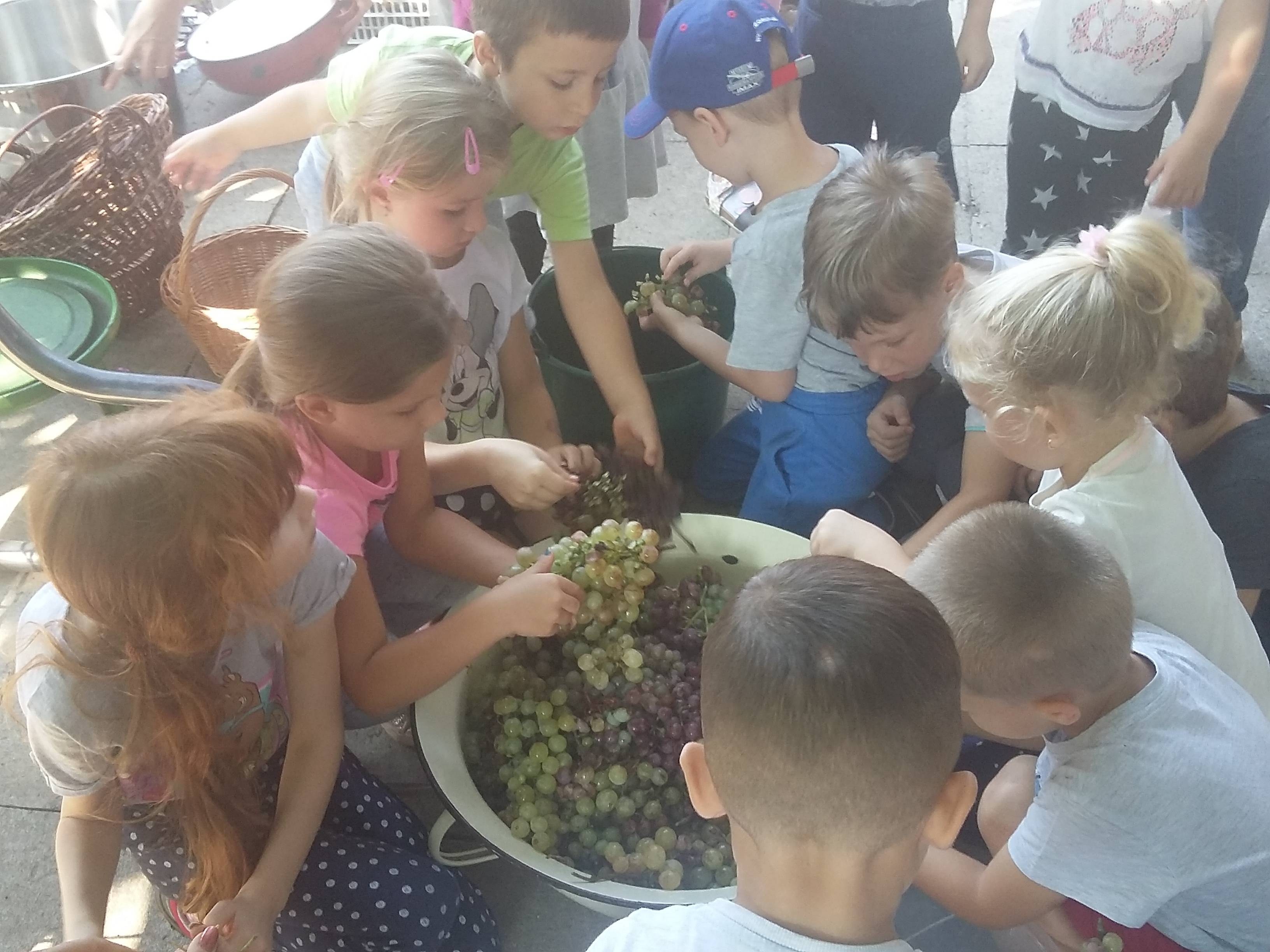 A szüretet egy pajtásunk családjának kertjében végeztük, a szőlő levágásában, a szemezgetésben, a darálás és préselés teljes folyamatában aktívan vettek részt a gyermekek.