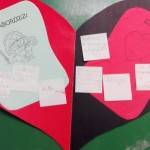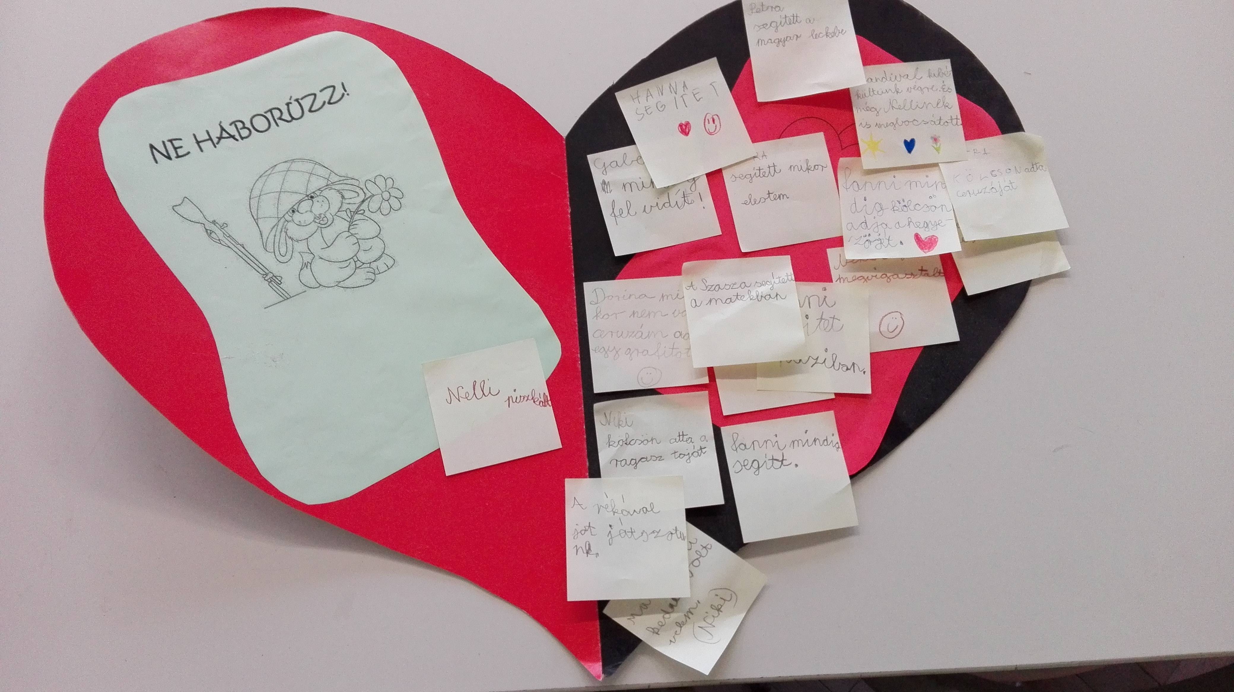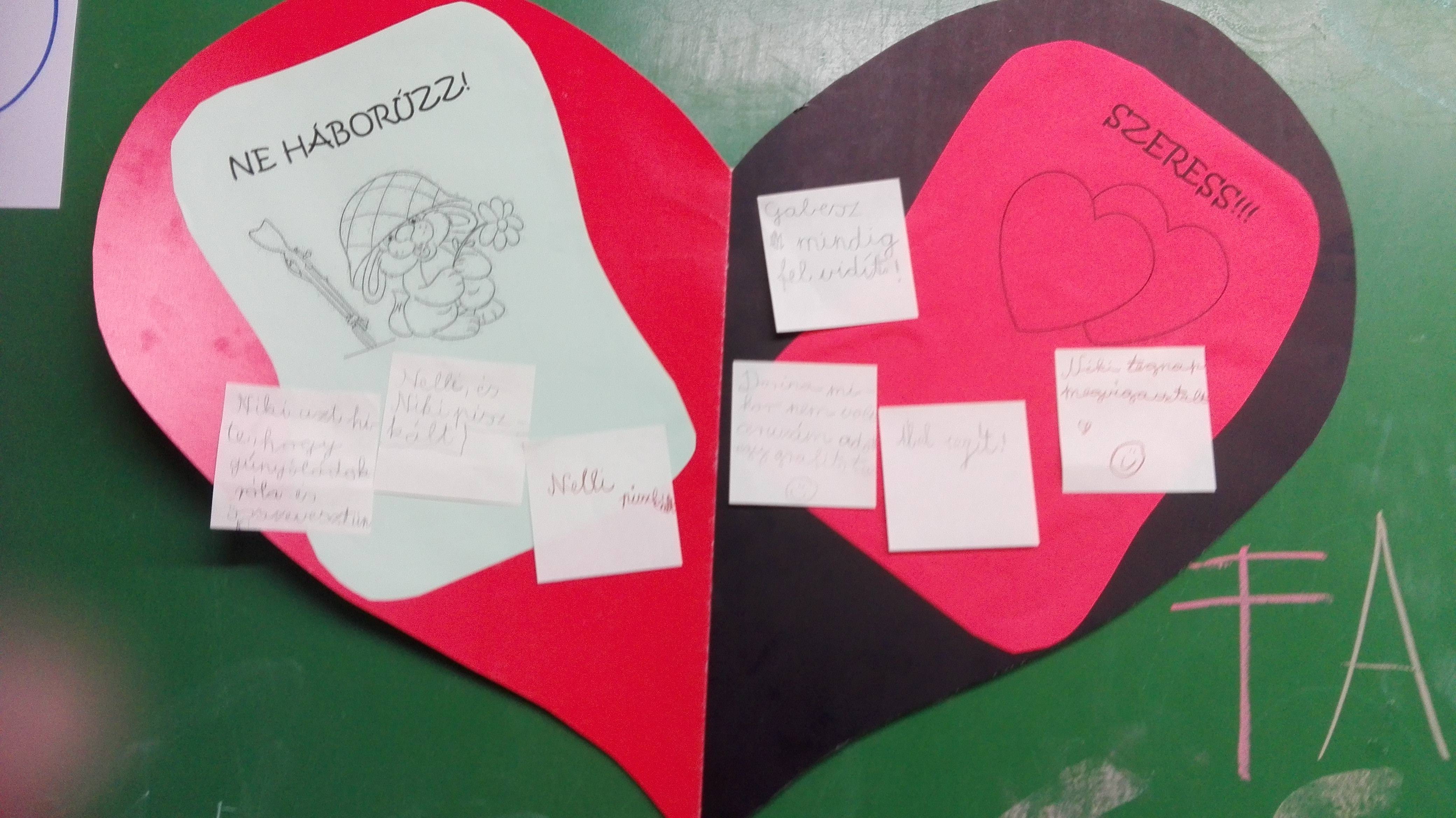 A II. félév kezdetén öszegyűjtöttük azokat a „sérelmeket”, amik legjobban zavarták a gyerekeket az első félévben. Kiderült, hogy az apró napi „piszkálódások” keserítik meg az életüket! Hosszútávú célként ezeket szerettük volna csökkenteni, majd megszüntetni. Eszembe jutott John Lennon örökérvényű mondata: „Szeress, ne háborúzz!” Így hát készítettünk egy szivet, amelynek egyik felel piros, a másik fele fekete lett. Ide írtuk fel azokat, akiknek még tanulni kellett a mottót, de ide kerültek azoknak a nevei is akik, már értették a lényeget! Hetente megbeszéltük az eseteket, és egyre kevesebb megjegyzés került a háború alá, míg a másik oldal tele volta szeretet jeleivel.