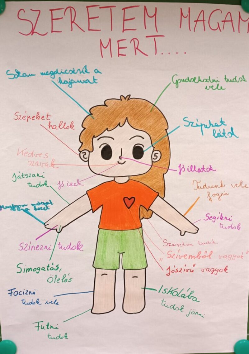 Átismételtük milyen testrészeink vannak, melyik testrészünknek, érzékszervünknek mit köszönhetünk. A gyerekek elgondolkodtak, kicsiben lerajzolták, ki mit szeret magát, milyen jó külső és belső tulajdonságaik vannak. Közösen elkészítettük a plakátunkat- „Szeretem magam, mert…” címmel. Ezen a plakáton jelöltük, mely testrész kinek miért fontos.