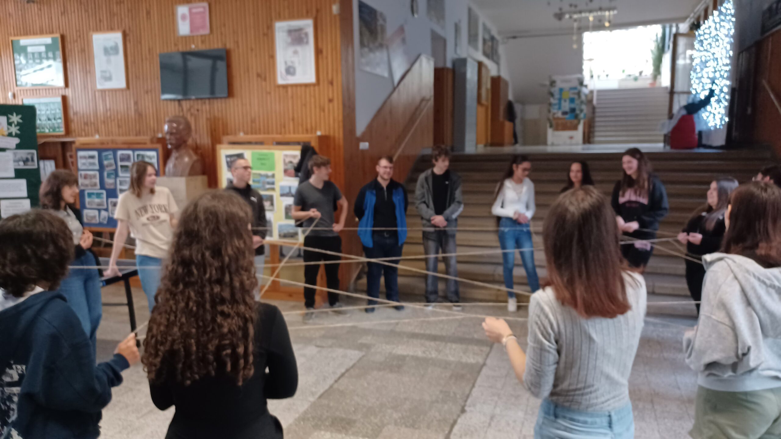 A Társas kapcsolatok témát novemberben két alkalommal dolgoztuk fel. Csoportmunkában a diákok táblázatot készítettek az optimista és a pesszimista beállítottságú ember jellemzőiről. Megcsinálták a Hunopti – tesztet, mindenki elmondta, mennyire érzik igaznak a pontszámok mutatta eredményt. Volt páros munka, filmrészlet vetítése, megbeszélése, idézetek megbeszélése; video vetítése a „hug me” – mozgalomról. Ez olyan nagy sikert aratott, hogy a diákok öleléssel búcsúztak egymástól és tőlem. Egy hét múlva az osztály tanulói- gyakorlati feladatként „szeretethálót” építettek (az osztály tagjai egymásnak dobták a fonalat, s aki dobta, mindig elmondta, mit szeret a másikban). Utána elmondták a diákok, mennyire jólestek nekik a „szerető” üzenetek. A fotókat feltöltöttem.
