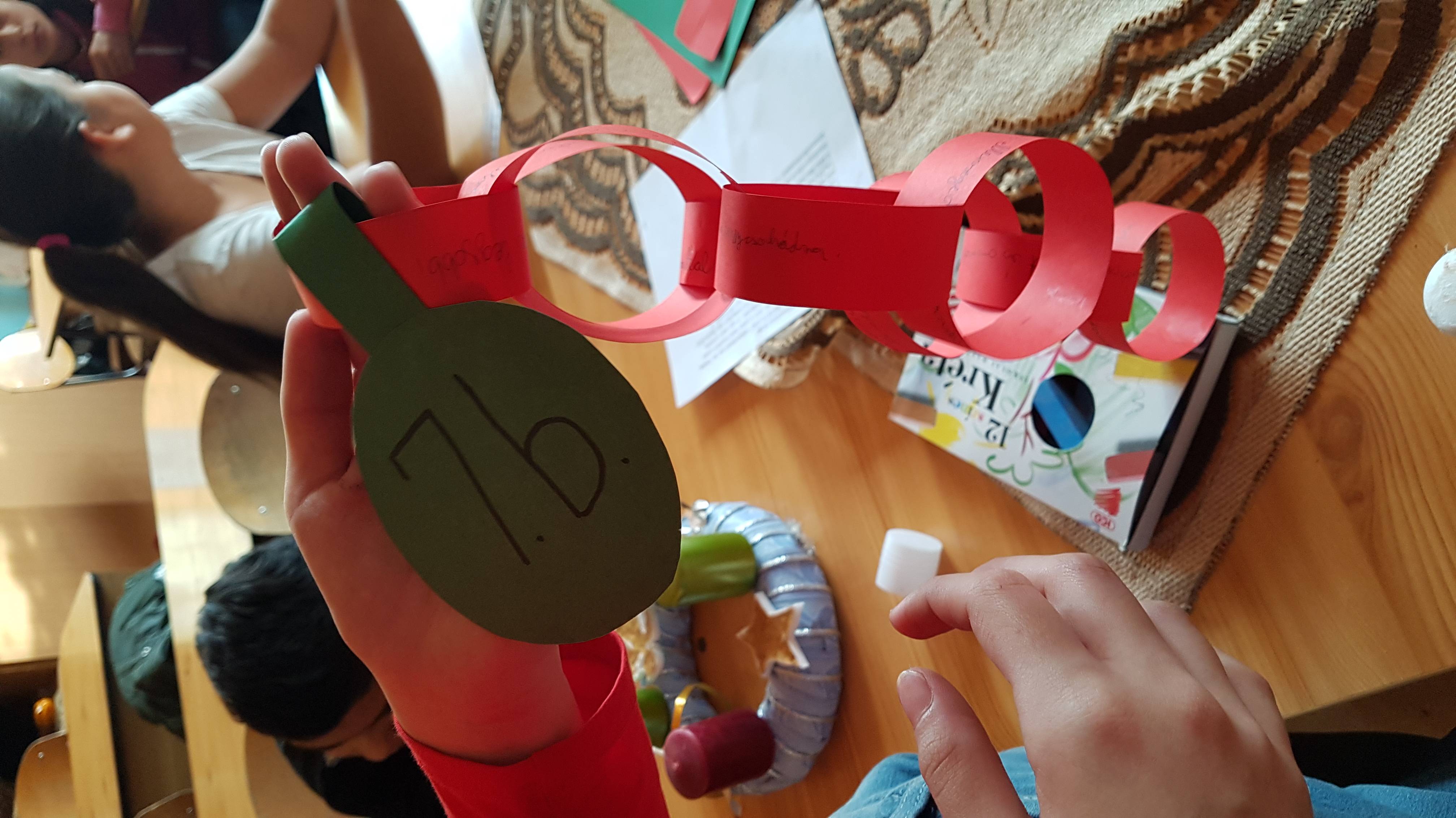 A szeretetláncot karácsonyi jókívánságokkal tűzdelve készítették el a gyerekek.