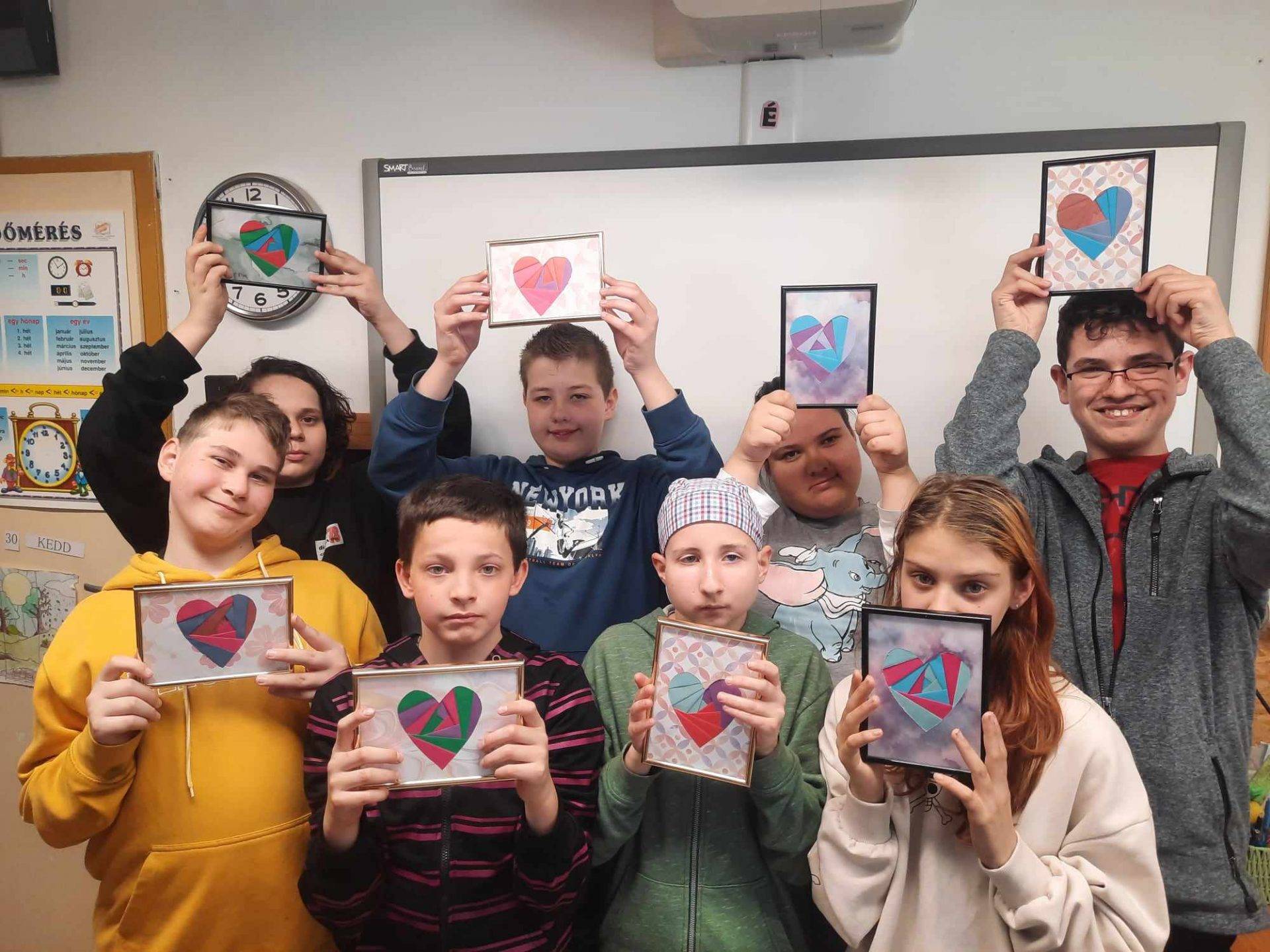 A gyerekek türelmesen, szépen dolgoztak, élvezték a szív kivágását, hogy ők választhattak maguknak színeket és hátteret. Elrepült az idő és el is készültünk a szívvel.