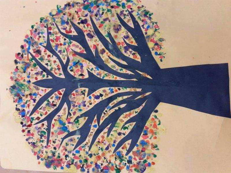 Az eredmény: a szivárvány színeiben pompázó fa lett. Minden felnőttnek azt kívánva, akinek hálásak, hogy ilyen fa alá állhassanak. Mert annyi féle lehet a hála, mint a fán lévő hála-nyomok.