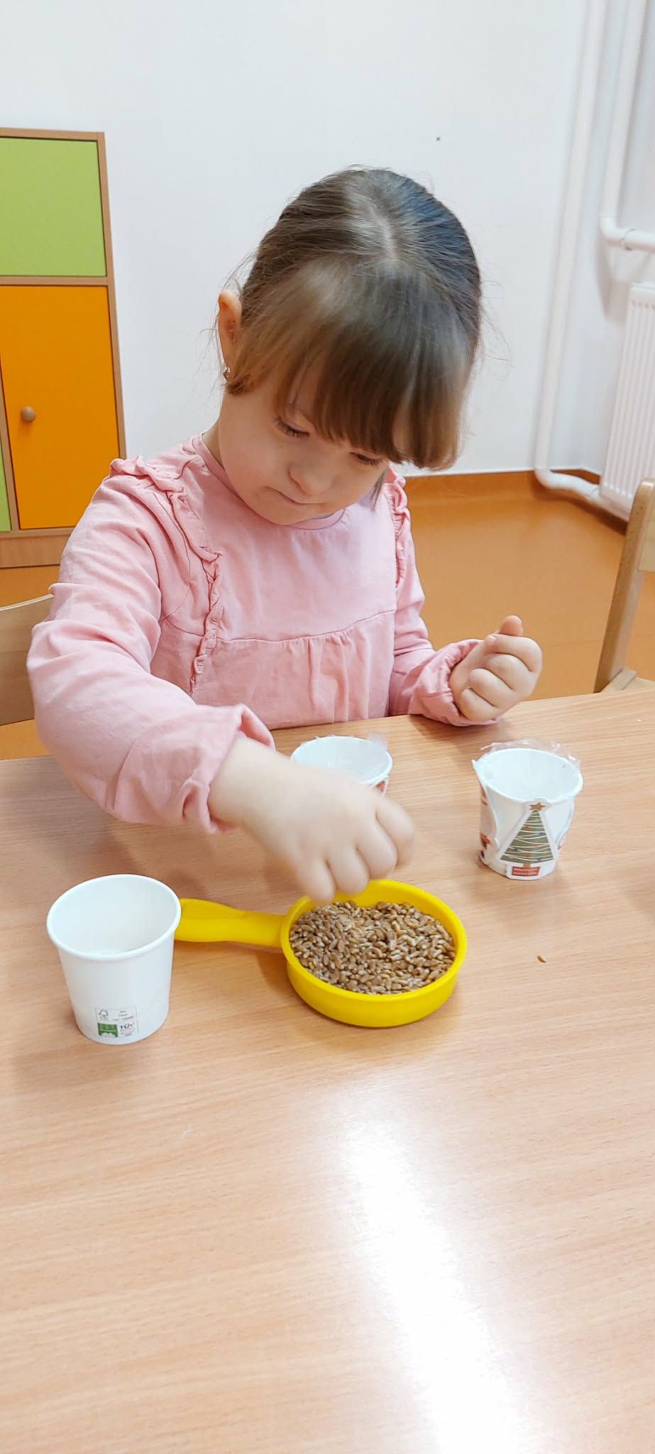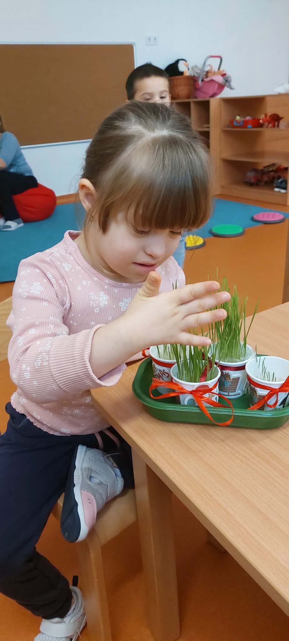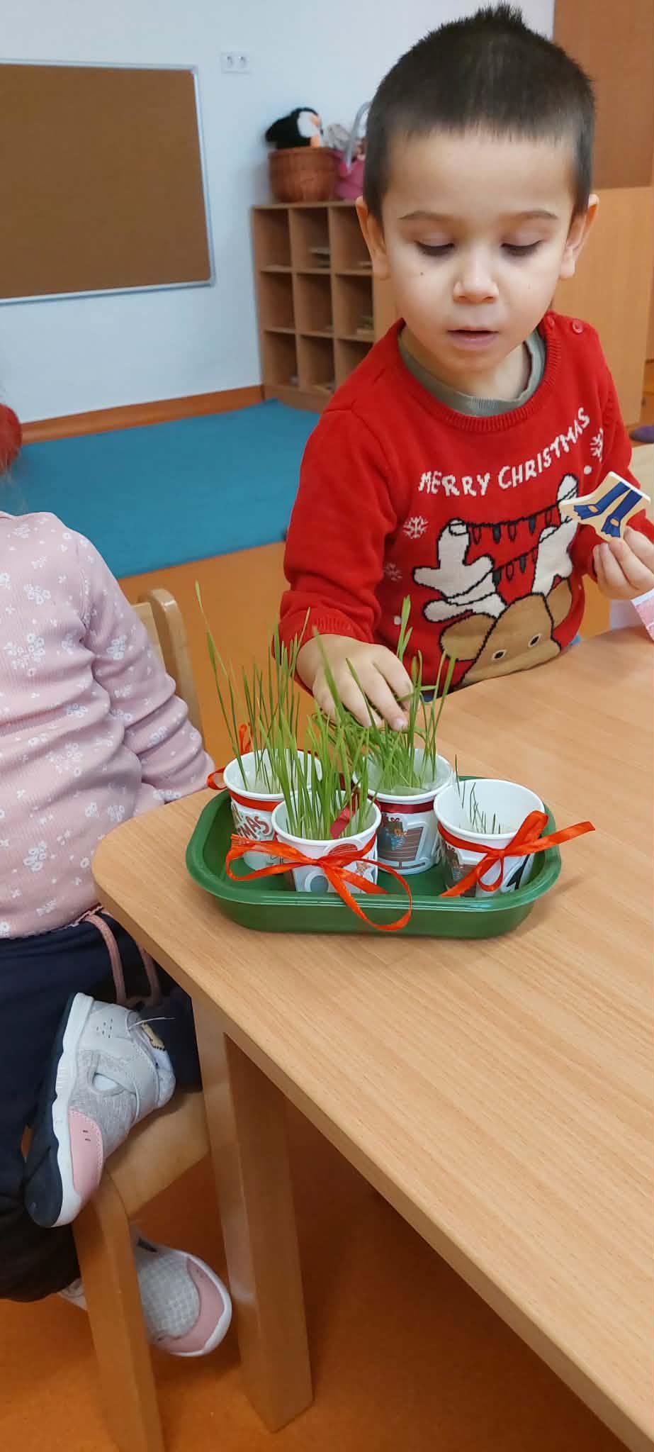 A decemberi Boldogságóra egyikén Luca-napi jóságbúzát ültettünk, amelyhez a szeretet, a figyelmesség és az egymás iránti gondoskodás élménye kapcsolódott. A gyermekek saját kis papírpoharaikat díszítették, ezekbe búzát ültettek, majd meglocsolták. A tevékenységet Luca-napi kotyolókkal és jókívánságokat megfogalmazó dalokkal tettük meghittebbé. A búza növekedését karácsonyig közösen figyeltük és minden locsolás alkalmával lehetőséget adunk arra, hogy a gyermekek megosszák egymással az aznapi kedves, segítő cselekedeteiket. A tevékenység során erősödött az empátia, a pozitív cselekedetek tudatosítása, valamint a közösséghez tartozás élménye.