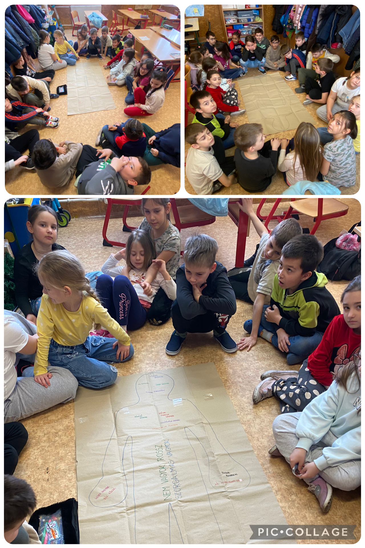 Ebben a hónapban a fő fókuszunk az apró örömök élvezete volt, ami segített a gyerekeknek abban, hogy ne csak a jövőbeni nagy eseményektől várják a boldogságot, hanem tanulják meg értékelni a jelen pillanatot is. A hónapot Nemes Nagy Ágnes Mennyi minden című versével indítottuk, amiről közösen beszélgettünk: rájöttünk, hogy a világ tele van kincsekkel, csak nyitott szemmel kell járnunk. Készítettünk egy közös rajzot is: egy óriási papíron körberajzoltunk egy gyermeket, majd odaírtuk a testrészekhez, hogy ki mit szeret magában. Nagy sikere volt az „Egy ölelés ereje” játéknak, ahol a megadott számok alapján hol saját magukat, hol a társaikat ölelték meg a gyerekek. A Szeretetkörben minden gyermek megfogalmazta, mit értékel önmagában és a mellette ülő társában, ezzel láthatóan erősítették az egymás iránti bizalmukat. A Képes képzelet gyakorlat során a gyerekek színes fotók közül választották ki azt az egyet, amely a leginkább lenyűgözte vagy ámulattal töltötte el őket. A feladat végén megbeszéltük, miért éppen az adott kép „szólította meg” őket, így segítve a szépség és a kiválóság egyéni szempontok szerinti felismerését és értékelését. A tornaszobánkat a Boldogságfokozó stratégiák élményparkjává alakítottuk át, ahol a gyerekek egy képzeletbeli sétát tettek. A vezetett túra során minden állomáson más-más boldogságfokozó játékot próbáltak ki, miközben hangsúlyoztuk, hogy nincsenek rossz válaszok, hiszen minden megélt pillanat és egyéni tapasztalat értékes.
