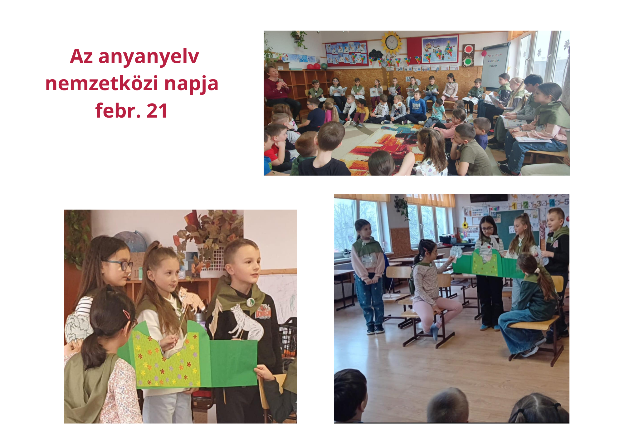 Pénteken pedig egy kisebb osztály tanulóit látogattuk meg, akik még nem tudnak olvasni, így felolvastunk nekik, verset mondtunk és egy mesét is előadtunk síkbábok segítségével. Így ünnepeltük meg előzetesen az anyanyelv nemzetközi napját