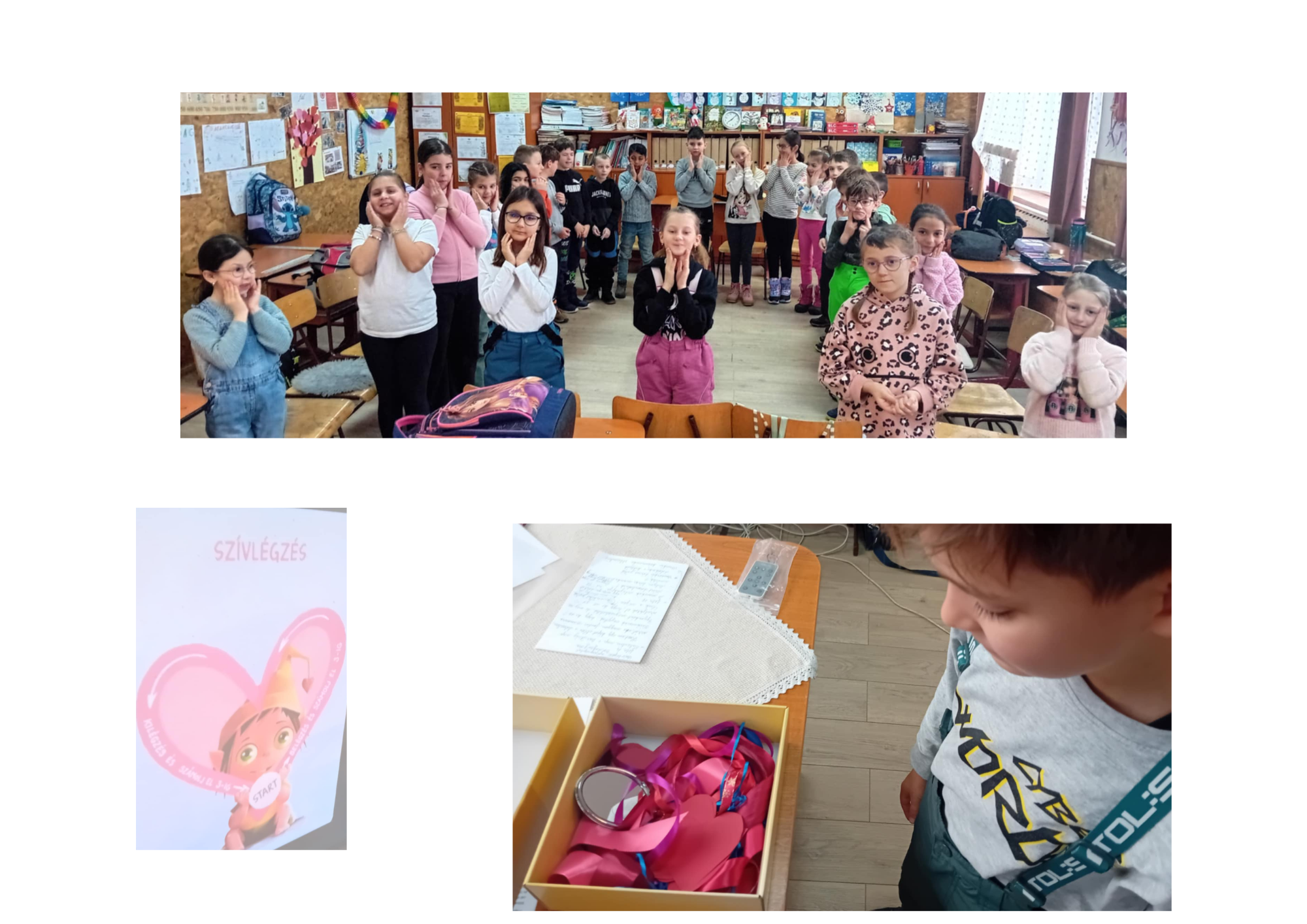 Mindenki kapott egy piros szivecskét, amire valami szép gondolatot, egy bíztató szót írt. Betettük egy dobozba és onnan mindenki húzott egy szivecskét, amit elolvasott és megőrzésként eltette.