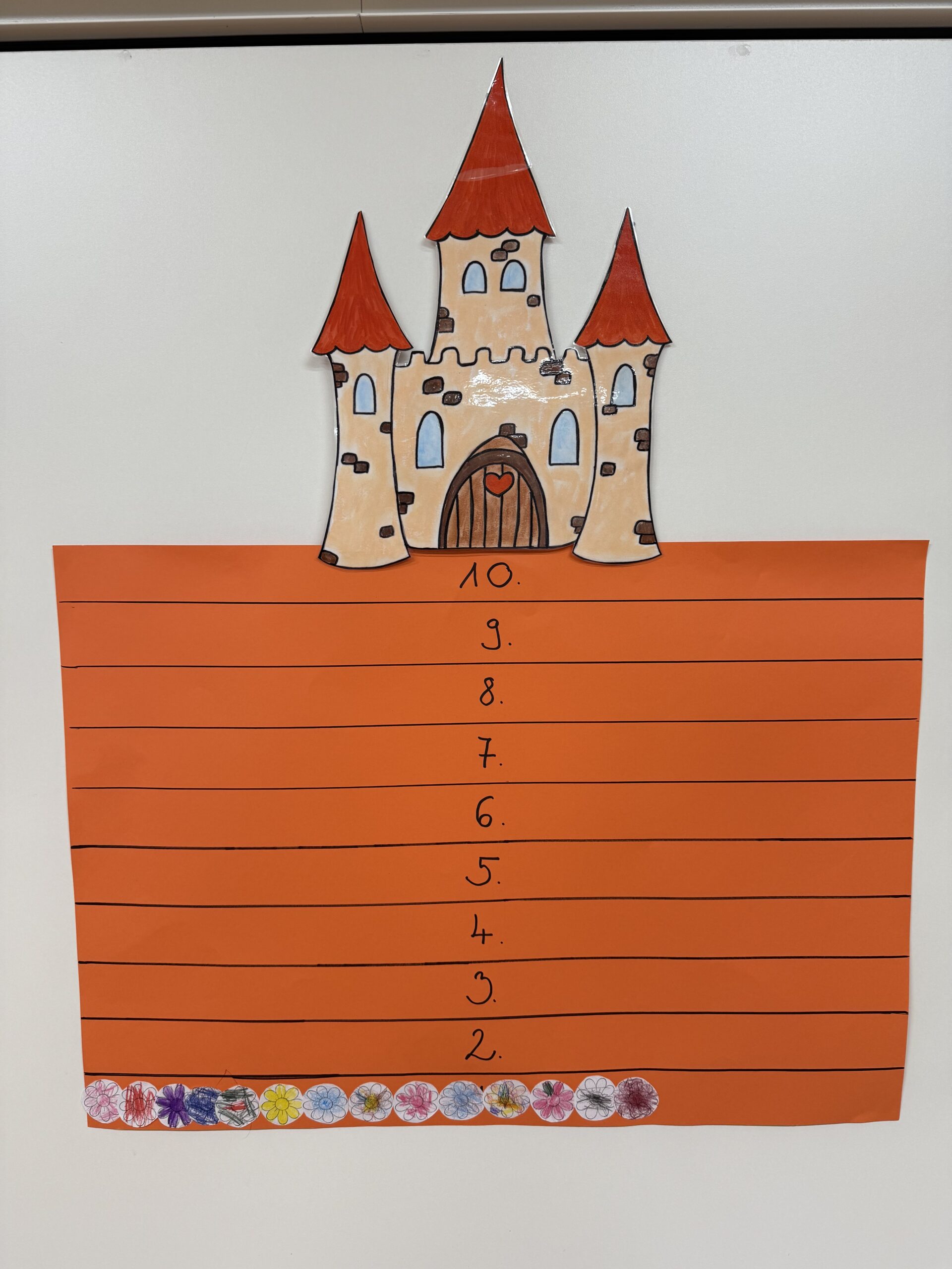 A jelképet zsírkrétával, ceruzával színezték ki, majd ragasztottuk fel az első lépcsőfokra.