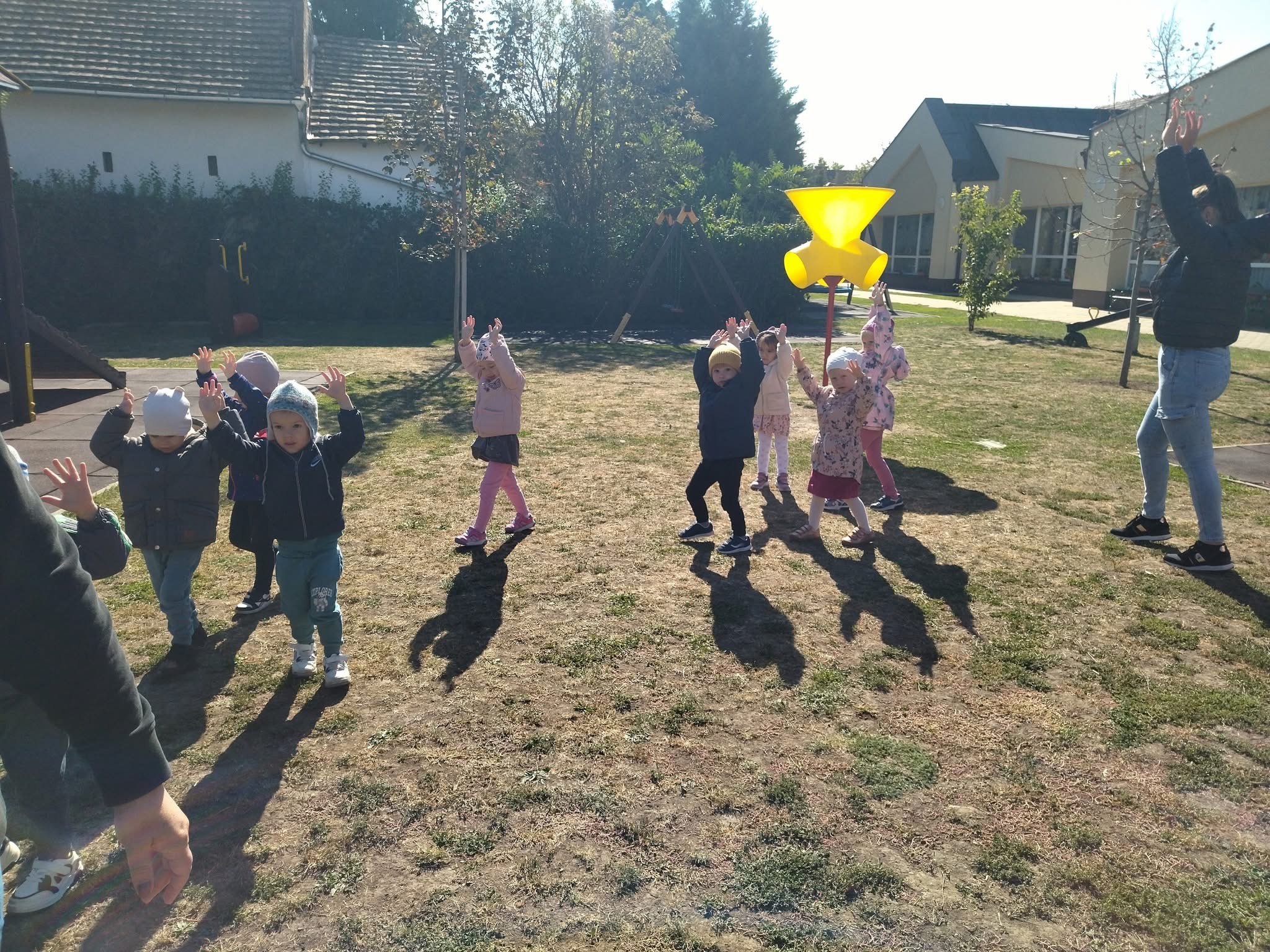 A kiscsoportos gyerekekkel az udvaron gyönyörködtünk az Isten alkotta teremtményekben (fák, virágok, égbolton :napocska, felhők)