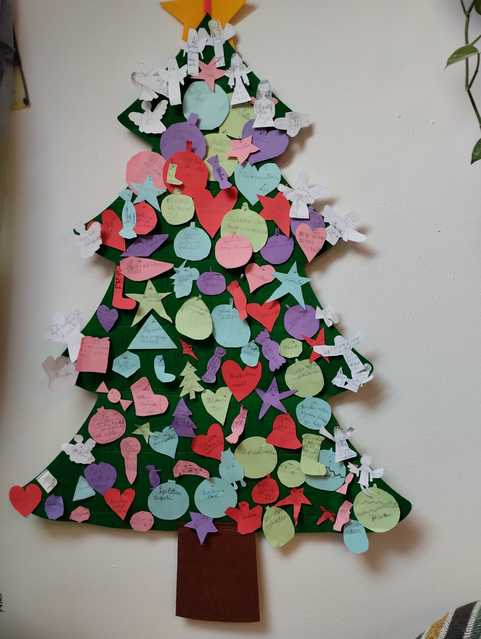 Elkészítettük a csupa jócselekedetekből álló karácsonyfánkat.