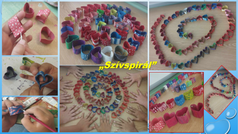 A kézművesség világnapja (június 10.) alkalmából WC-papír gurigákat hasznosítottunk újra. Mindenki 4 szeletet vágott a hengerből, ezeket hajtogattuk meg szívecske formájúra, amiket aztán temperával kifestettünk, kidíszítettünk. A szívecskéket aztán száradás után egymás mellé rakosgattuk, így alakítottunk ki egy „szívspirált”, ami azt mutatta meg nekünk, hogy a kis dolgok, ha összeadódnak, egy nagyobb, nemesebb dolgot fognak eredményezni és boldoggá tesznek minket.