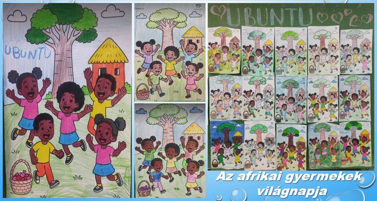 Az afrikai gyermekek világnapjához kapcsolódóan (június 16.) elolvastuk az „UBUNTU” című mesét, ami a tartós boldogság kulcsát adta a kezünkbe. A történet kapcsán a gyerekek ráébredtek arra, hogy a versengés, az irigység helyett sokkal jobb, ha együttműködünk és igazságosan elosztunk egymás között mindent. Az afrikai törzs gyerekei is ezt tették, hiszen nem kezdtek el versengeni a cukorkákért, amit a tudós adott nekik, hanem szépen kézen fogták egymást, együtt odasétáltak a cukroskosárkához, körbe ülték azt és teljes nyugalomban megosztoztak az édességen. Senki nem kapott se többet, se kevesebbet. Megtudtuk, hogy az UBUNTU azt jelenti: „Az ember csak mások által válik emberré.”. Egy kisfiú azt nyilatkozta a mesében, hogy nem tud úgy boldog lenni, ha a társai szomorúak. A valódi boldogság tehát nem mások ellenében, hanem együtt, egymásért születik meg. Hogy ezt soha el ne feledjük, az afrikai gyerekekről készített vidám képet kiszíneztük és feltettük a faliújságra.