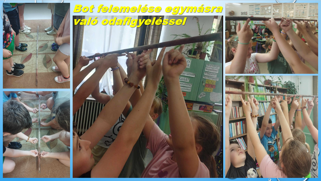 A „botemelős” feladat a közösségformálást segítette, hiszen megmutatta a gyerekeknek, hogy egymással szemben állva csak úgy tudják felemelni a botot, közös erővel, csak a mutatóujjukat használva, ha figyelnek egymásra és rendkívül körültekintően, óvatosan cselekednek. A gyakorlat többszöri próbálkozás után ugyan, de meglepően gyorsan és ügyesen sikerült, nagy élményt jelentett a gyerekek számára.